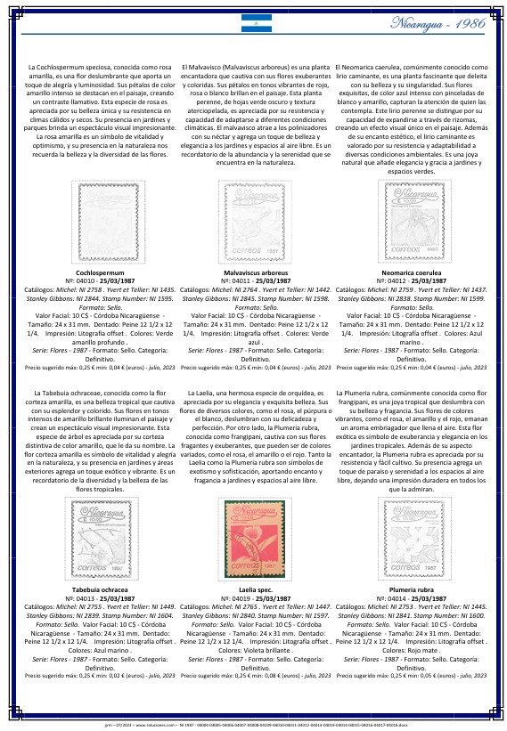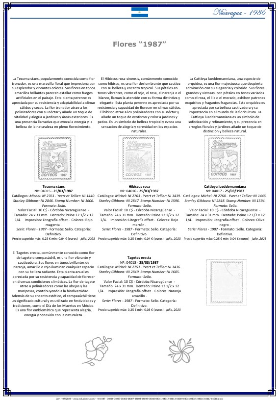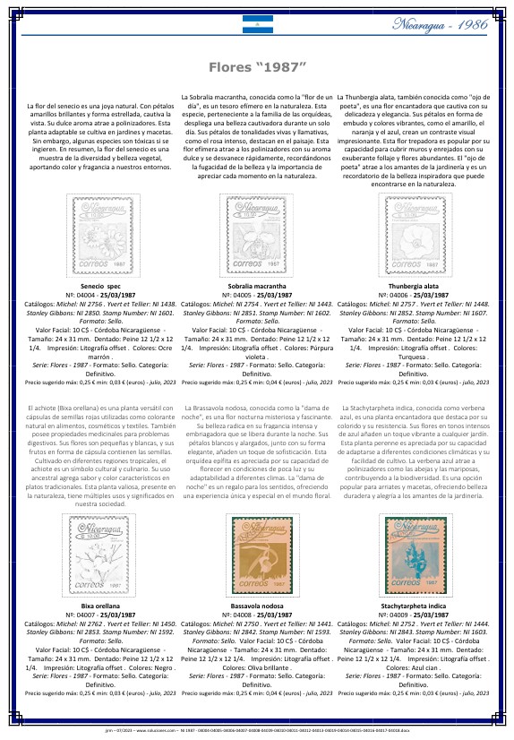 Nicaragua 1987 – Flores | Ficha PDF sellos (Catálogo NI 1987 - 04004-04005-04006-04007-04008-04009-04010-04011-04012-04013-04019-04014-04015-04016-04017-04018)