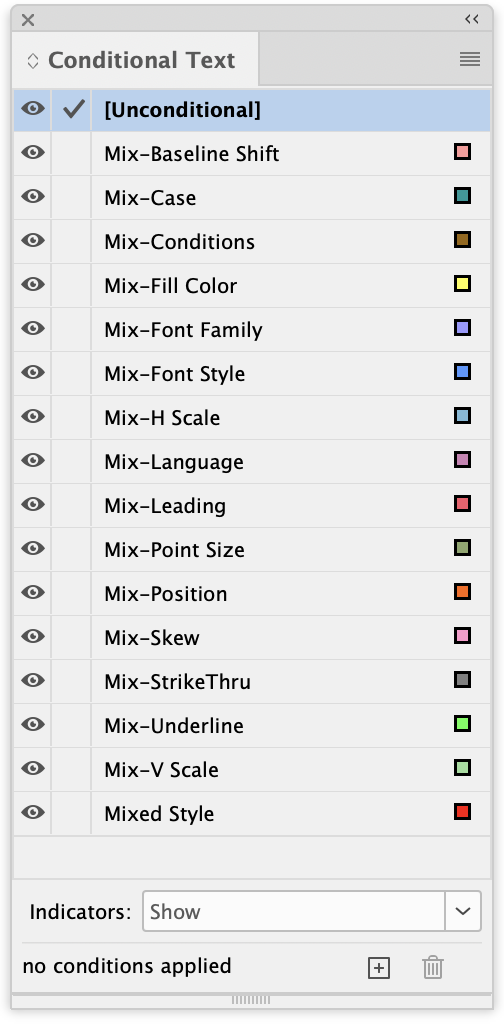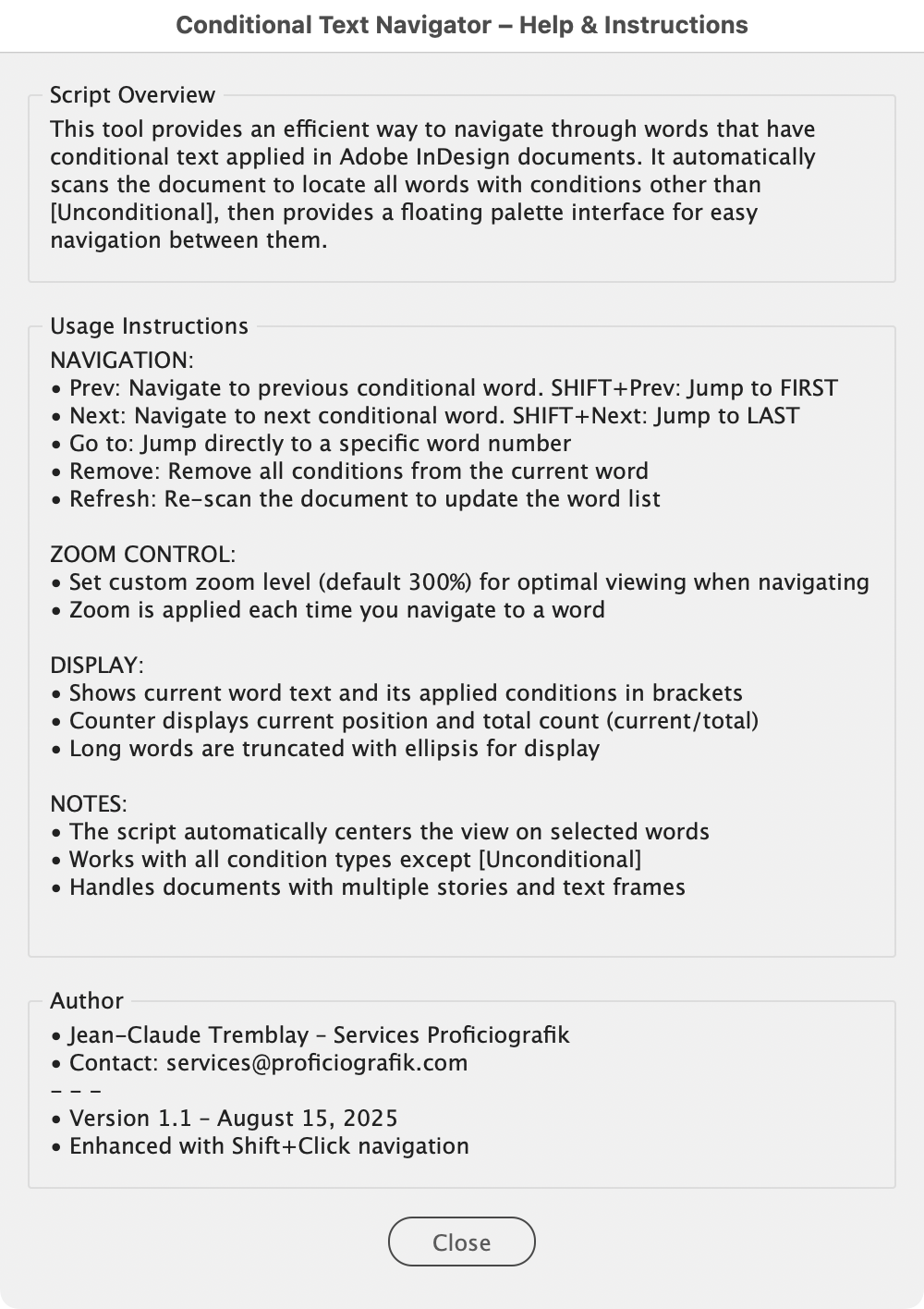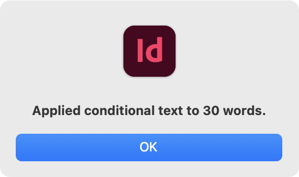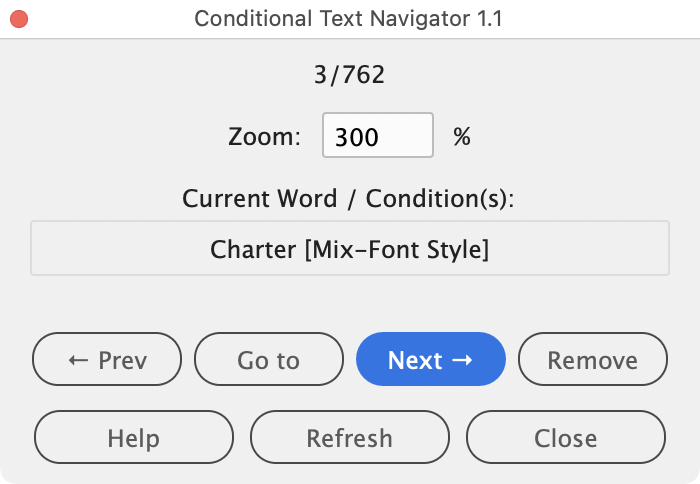 This script provides a floating palette interface for efficiently navigating through words that have conditional text applied in your document. It automatically scans all stories to locate conditional words, then provides intuitive navigation controls to move between them, jump to specific word numbers, and remove conditions as needed. Perfect for use with the Mixed Format Marker 3.1
