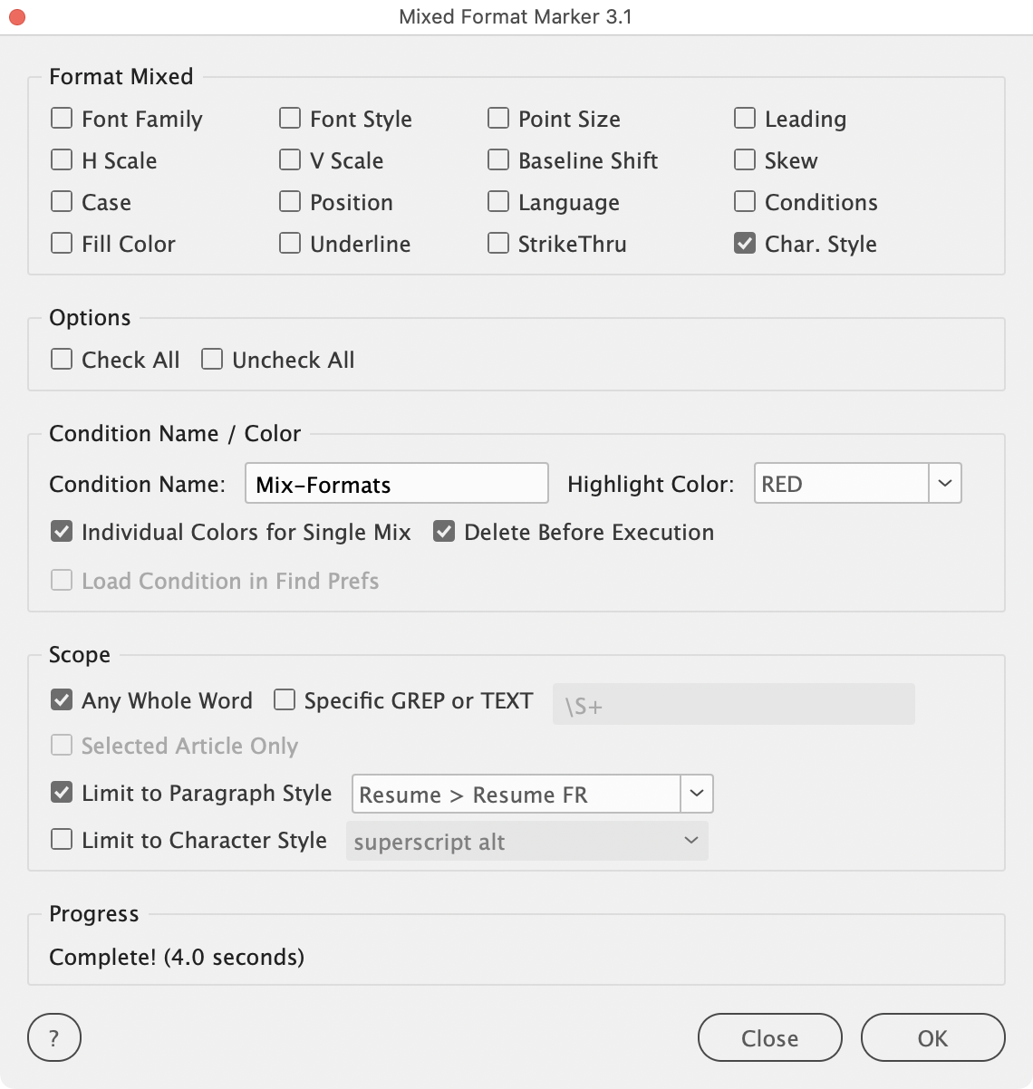 Mixed Format Marker automatically identifies words containing mixed character formatting throughout your document. It scans for inconsistencies in font family, font style, point size, leading, scaling, baseline shift, skew, case, position, language, conditions, fill color, underline, strikethrough, and character styles within individual words, then applies customizable conditional text highlights to mark these problem areas.