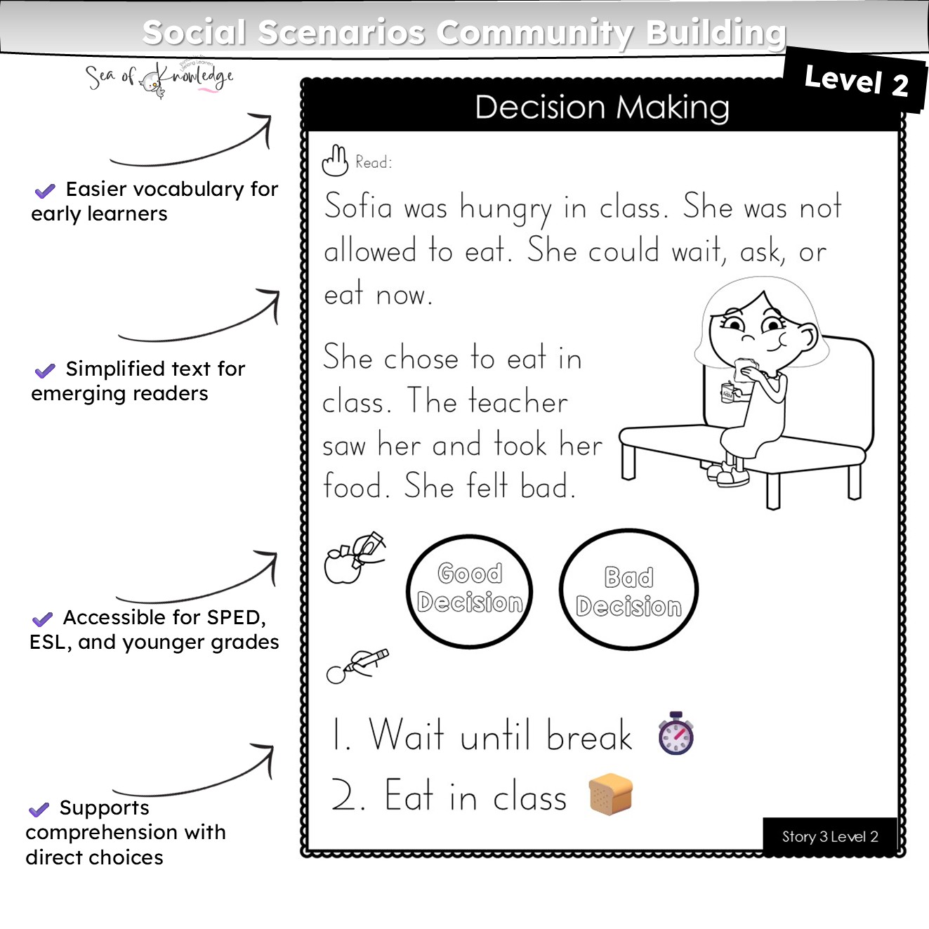- 10 Level 2 scenarios with simplified wording and visuals (perfect for early learners).