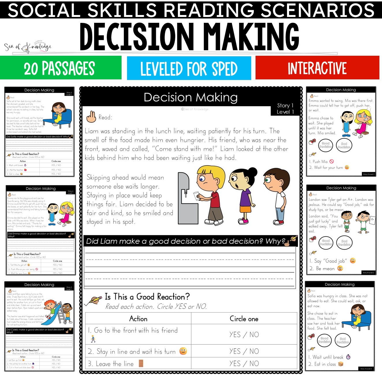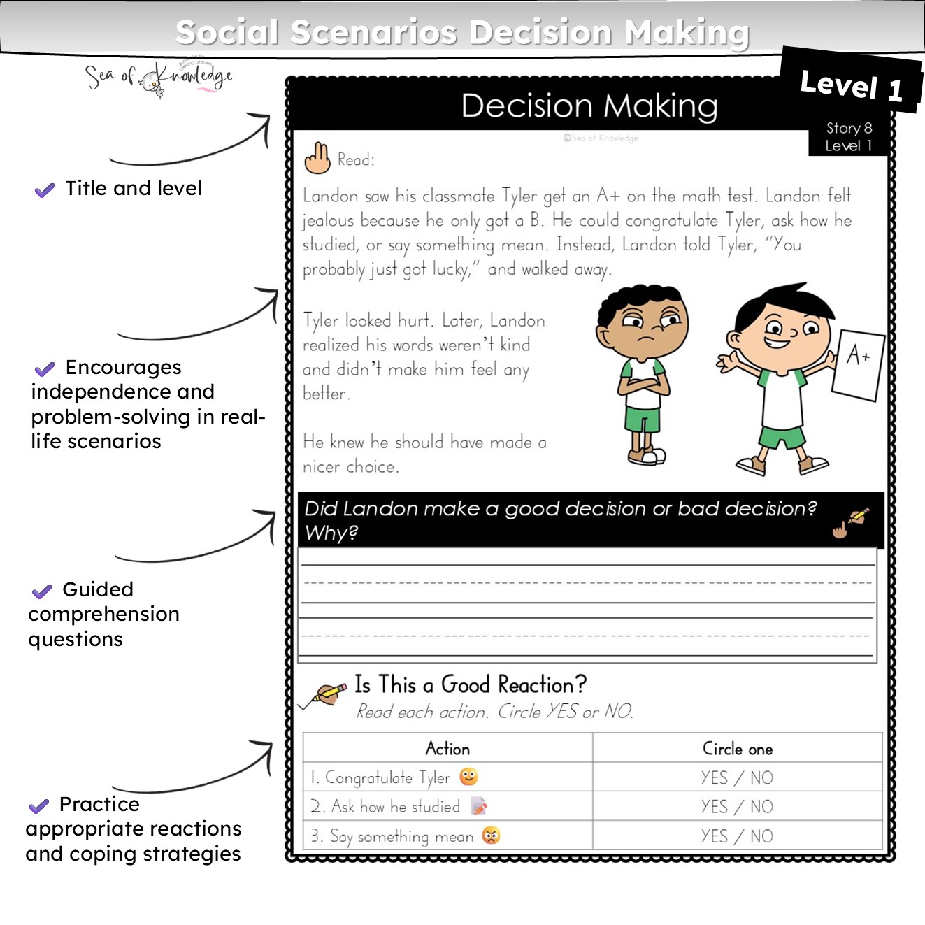 decision making activities for kids, SEL decision scenarios, classroom problem solving worksheet, good choice bad choice SEL, leveled social skills lessons, social emotional learning elementary, behavior management tools, social emotional regulation, printable decision making stories, small group SEL activities.