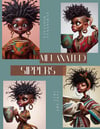 - Unique characters wearing Afrocentric prints and holding oversized items like mugs for a quirky, statement-making vibe