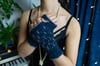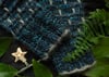 Silver mohair stars twinkle on a background of rich hand-dyed Merino wool, a constellation in your hand. The luxurious fibres knit into a sumptuous fabric, a delight to knit and wear. An afterthought thumb construction allows the stitch pattern to continue uninterrupted through the hand. I-Cord Bind-Off completes the trim.
