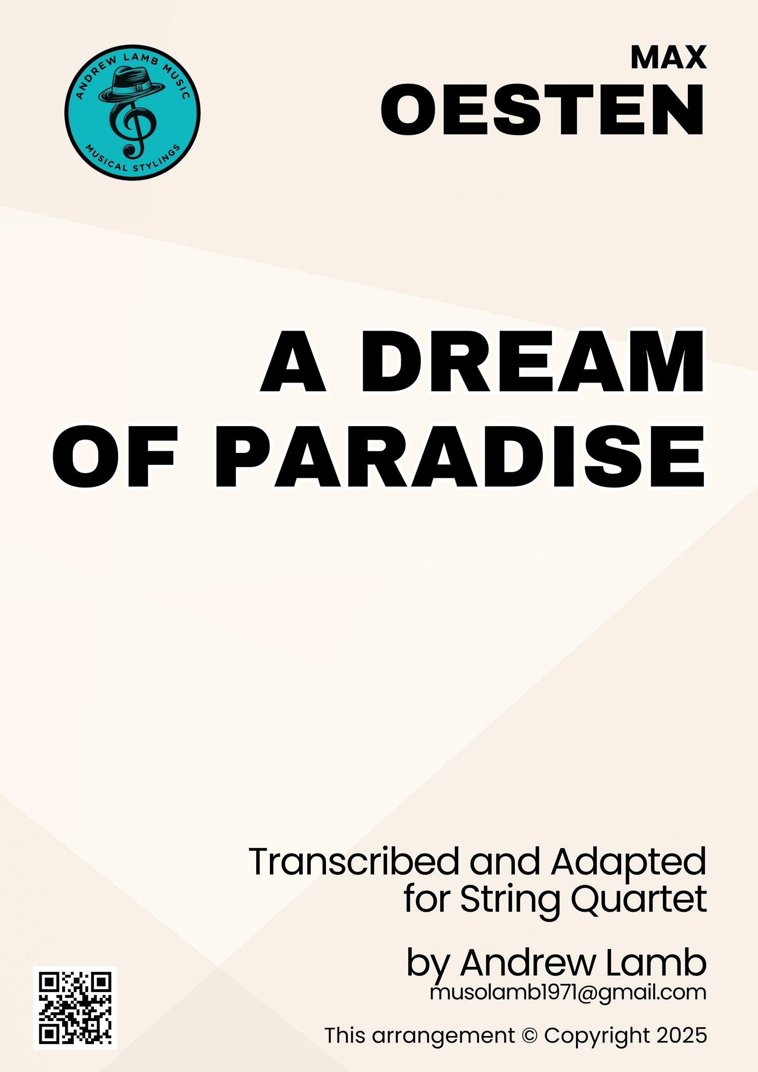 Bring the gentle, dreamlike beauty of Max Oesten’s A Dream of Paradise into your next performance. Originally composed for organ/harmonium in 1905, this new arrangement transforms the piece into a warm, lyrical work for string quartet, perfect for concerts, weddings, recitals, or reflective moments.