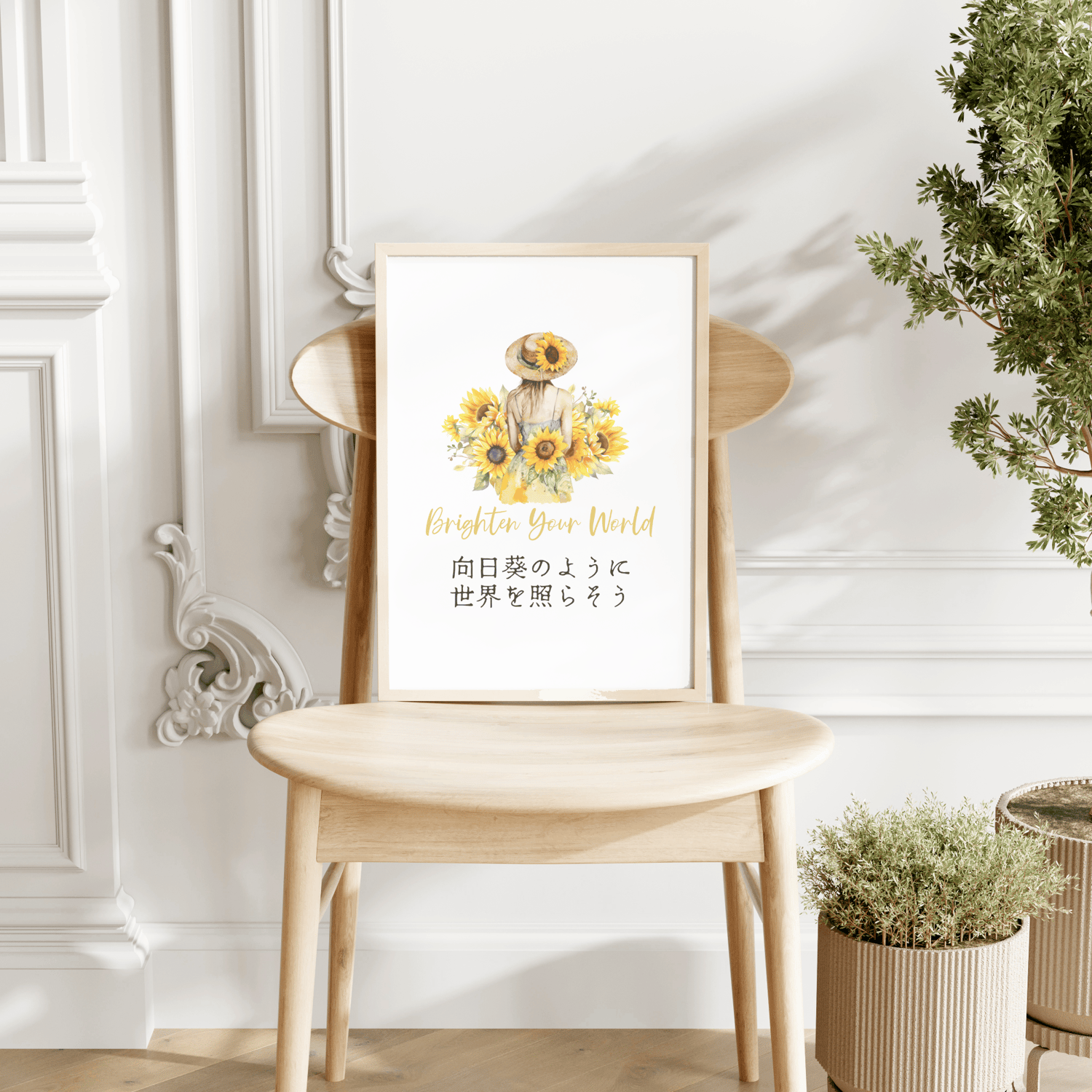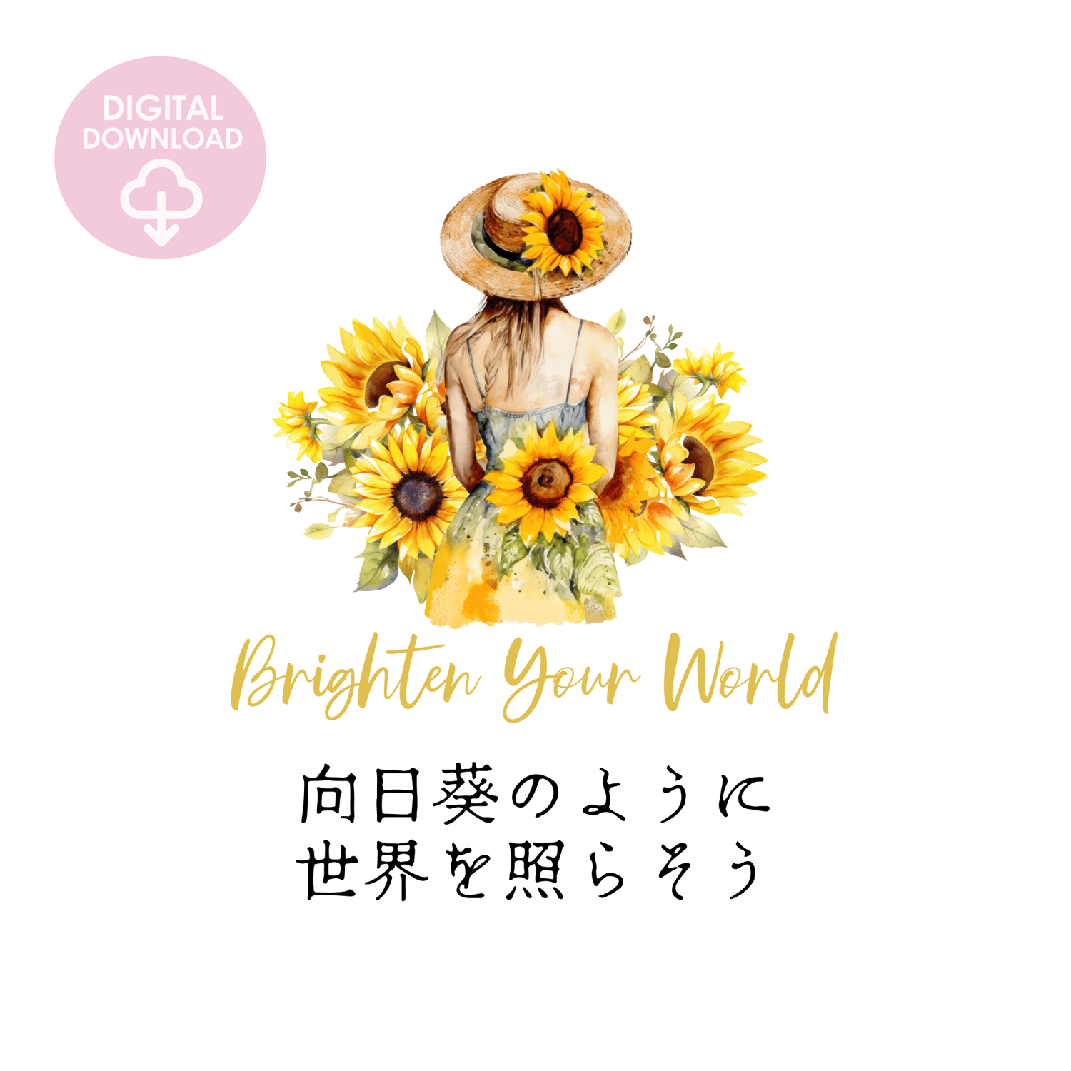 Bring a burst of sunshine into your girl's room with this beautiful printable wall art. Featuring a watercolor illustration of a girl surrounded by yellow sunflowers and an uplifting quote in Japanese, this piece combines beauty and positivity. The unique typography adds a touch of cultural flair, making it a standout decor item.