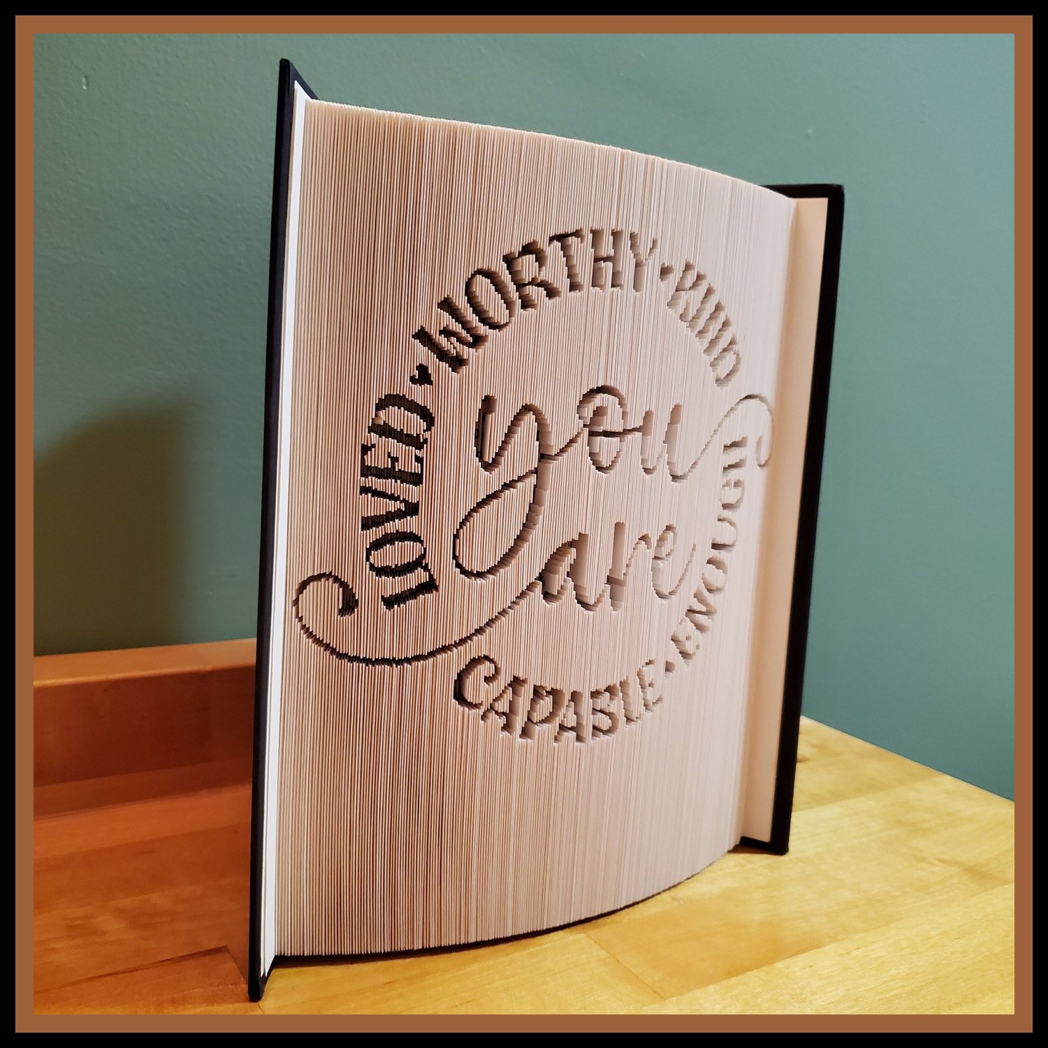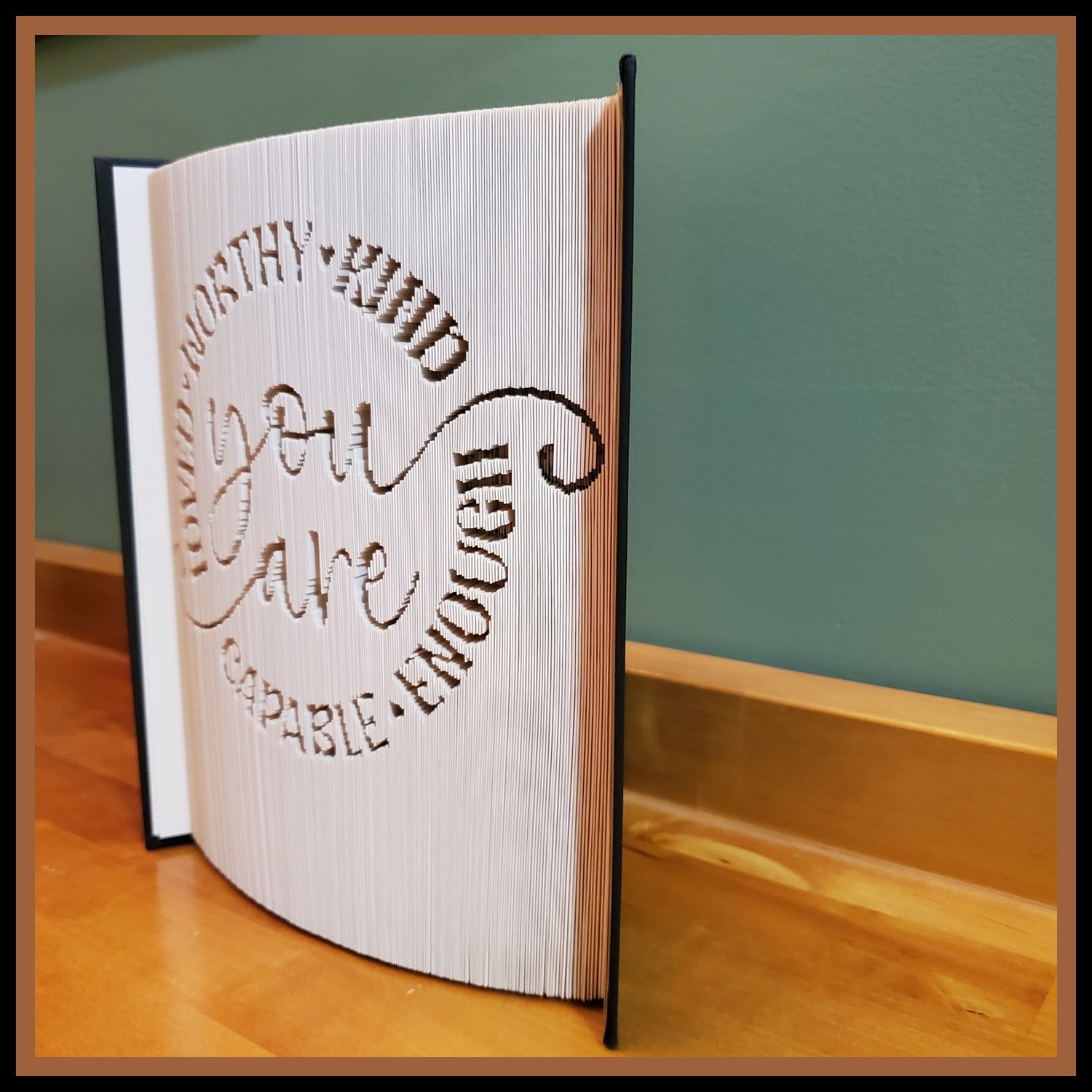 This uplifting folded book art pattern features the inspiring message “You Are Enough”, surrounded by empowering words that celebrate strength, self-worth, and resilience. The elegant circular layout creates a balanced and eye-catching design that serves as a daily reminder of confidence and positivity.