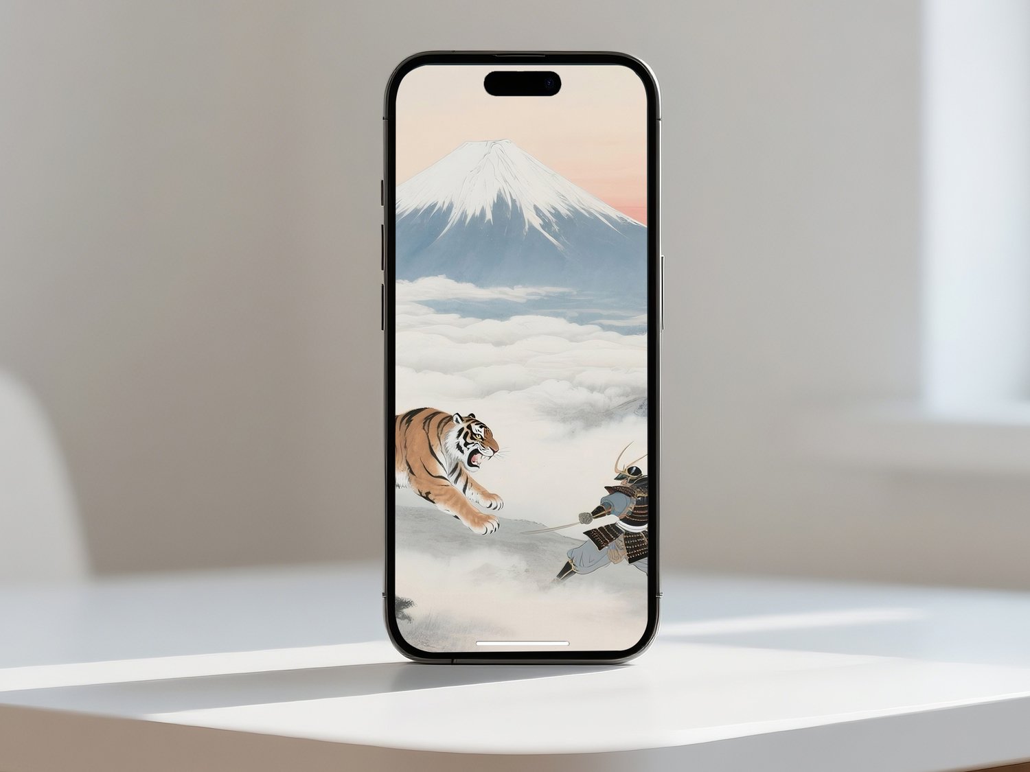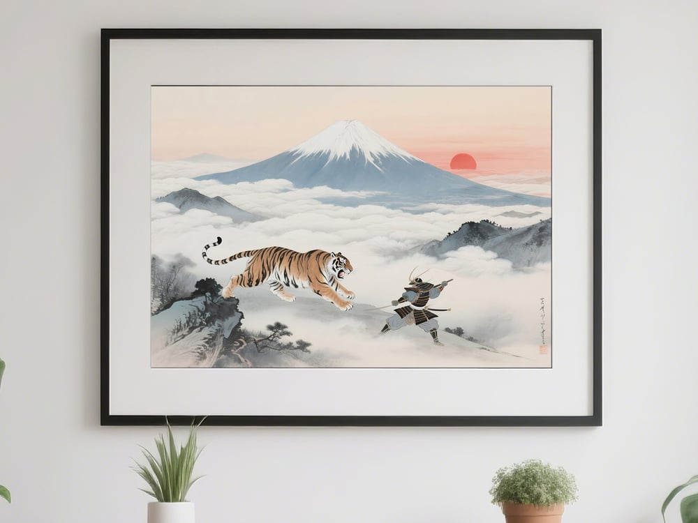 A powerful Feng Shui digital artwork featuring a samurai facing a tiger under Mt. Fuji and a rising sun.