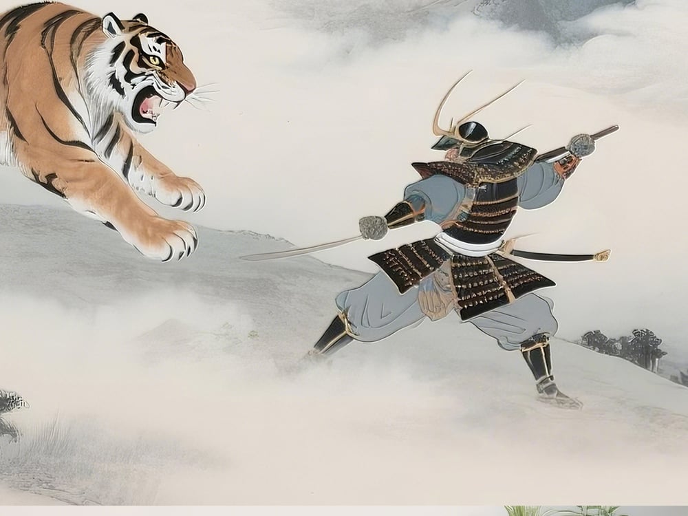 **Powerful feng shui digital art depicting samurai facing a tiger**