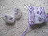 The bonnet and trousers fasten with ribbon, and the shoes fasten with a buttoned ankle strap.