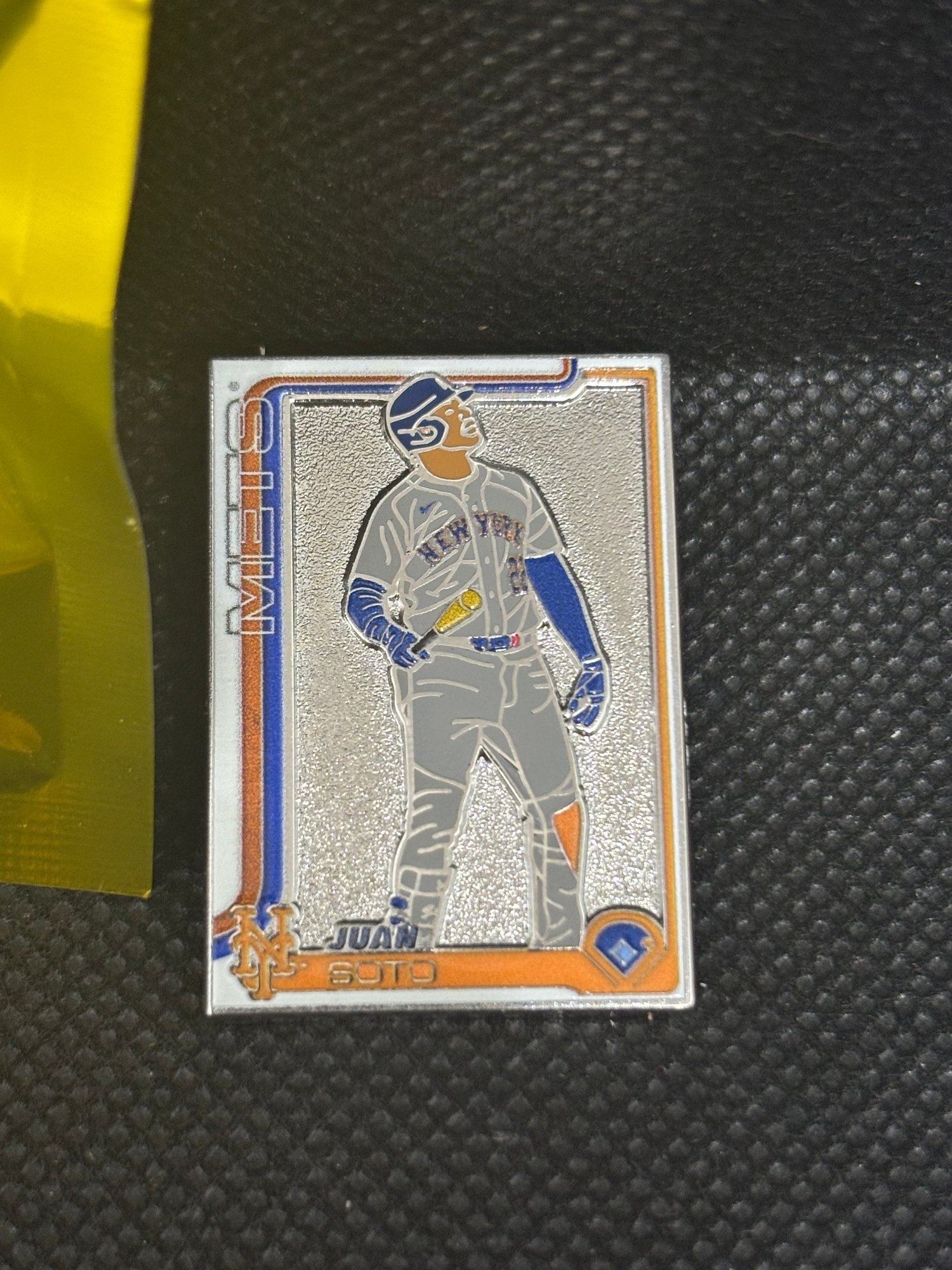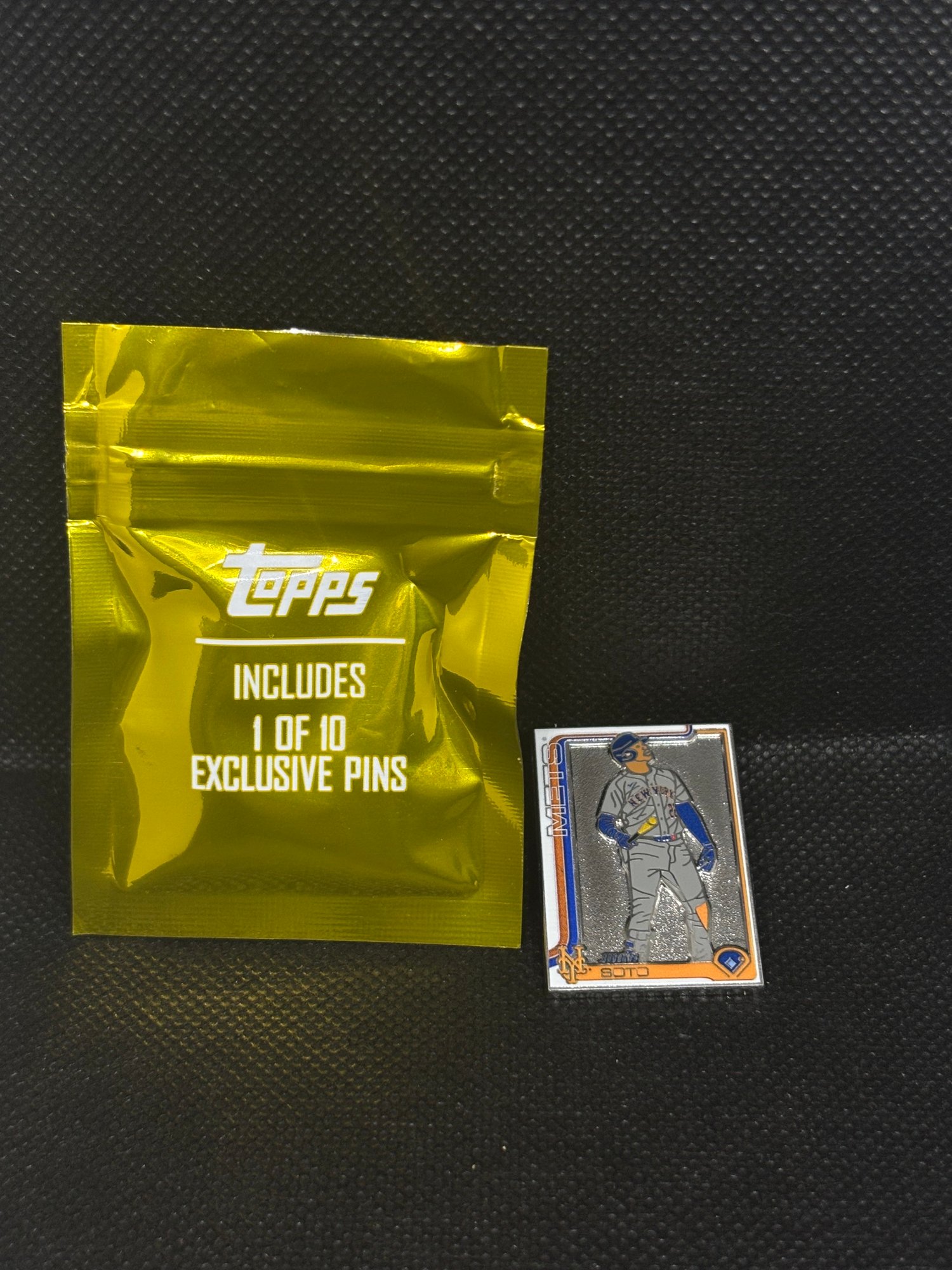 A limited-edition Topps Exclusive Pin featuring superstar Juan Soto in his Mets uniform. Part of a special chase insert series, only 1 of 10 unique player pins were produced. Each piece combines the design of a classic Topps baseball card with the finish of a collectible enamel pin — perfect for collectors looking for something beyond cardboard.