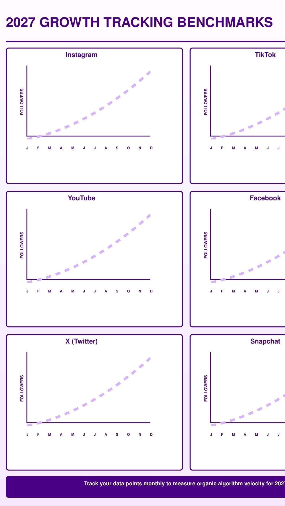 2026/2027 Growth Benchmarks with graph templates for Instagram, TikTok, YouTube, Facebook, X, and Snapchat