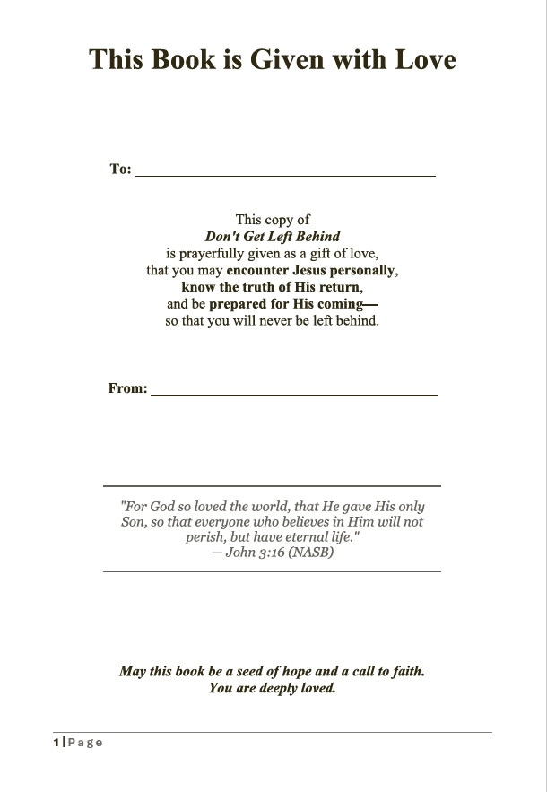 "Don't Get Left Behind" isn’t just another book on Bible prophecy—it’s a heartfelt and urgent invitation to understand God’s plan for the end times and respond in faith before it’s too late.