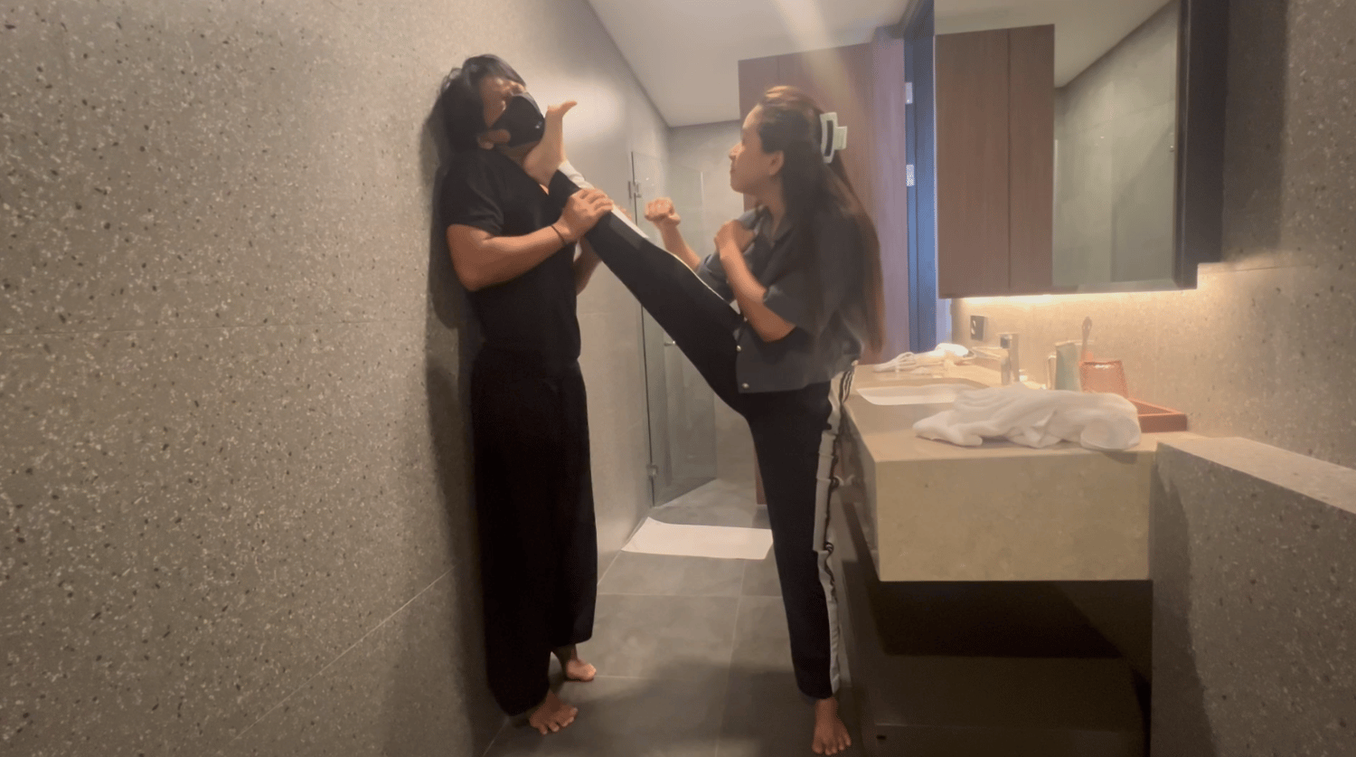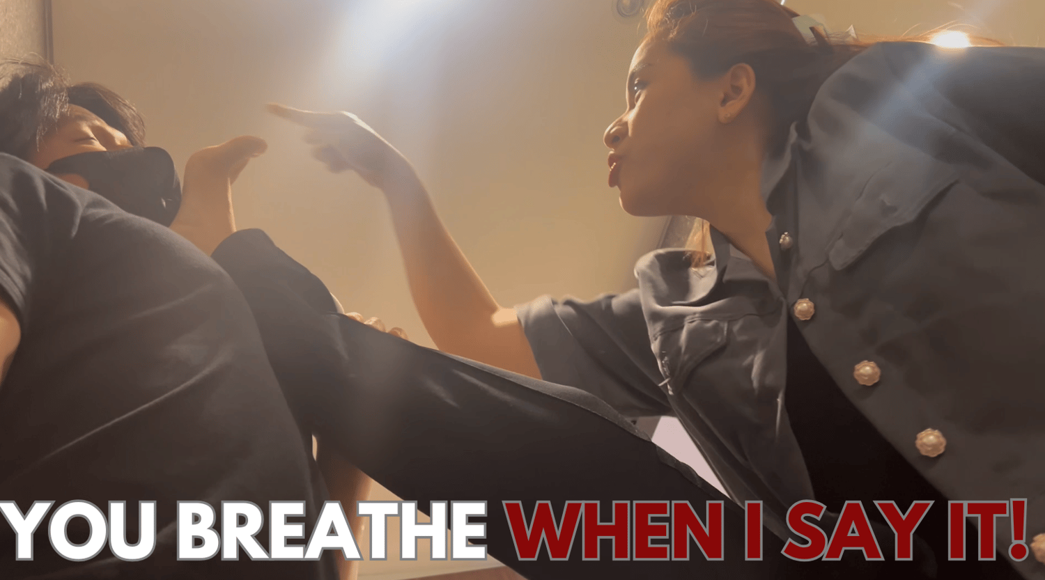 type: domination terror bully pin with leg on throat, bullying, breath play