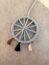Bestandteile: Holzrahmen, Wolle, Metallanhänger, Stofffransen