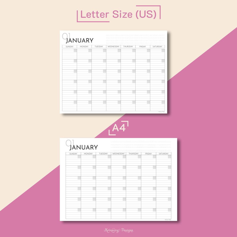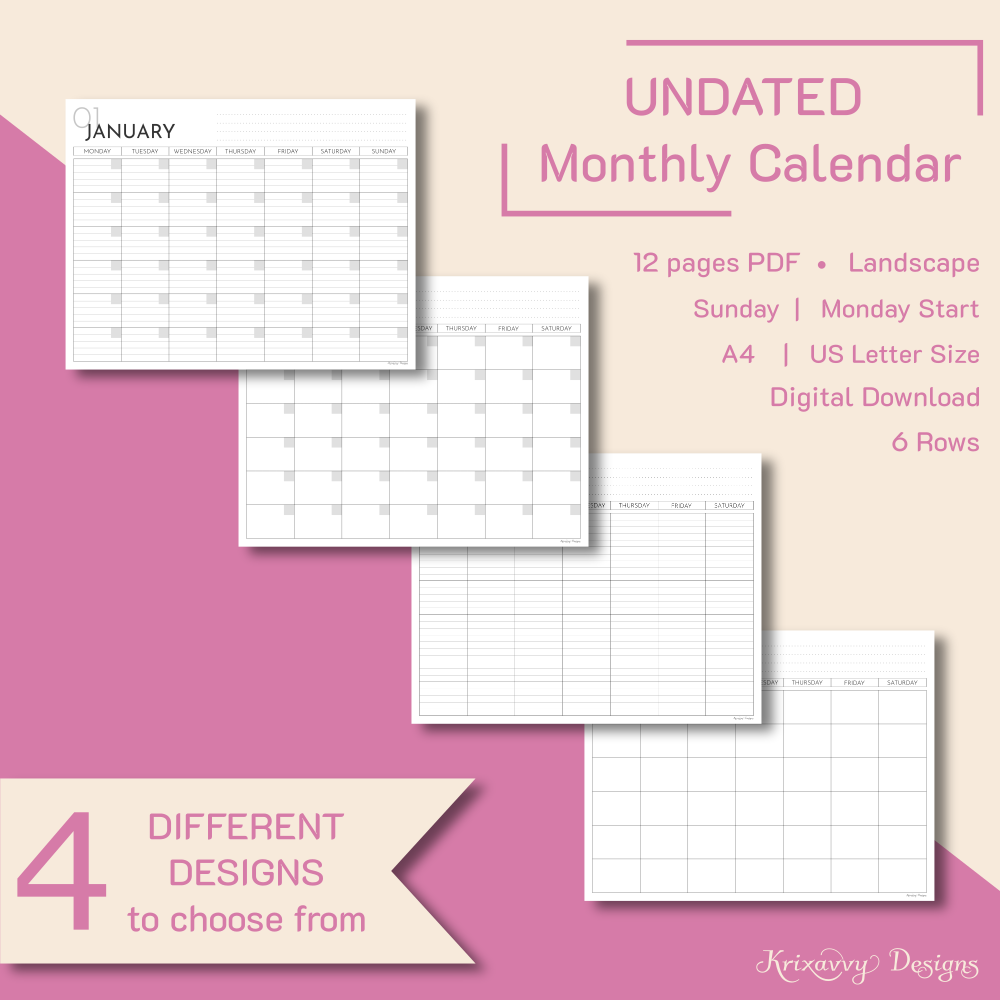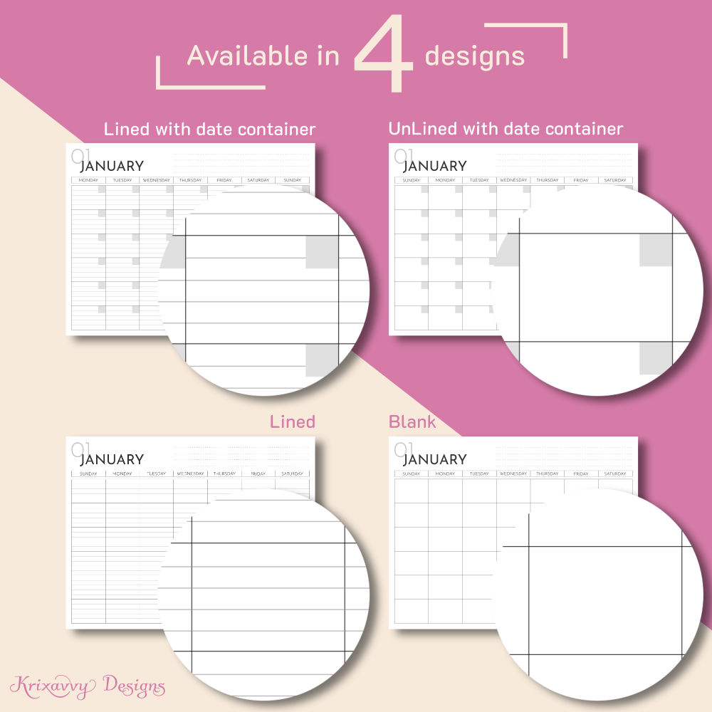 Classic Charm Meets Minimalist Design: Your Perfect Planner Awaits. Discover our Printable Undated Monthly Calendar Planner in Classic Design, a perfect blend of minimalist and timeless aesthetics. This Undated monthly calendar is ideal for those who appreciate simplicity and elegance. Choose between four distinct options which we have carefully curated showcasing its own set of features to cater to different preferences and needs.