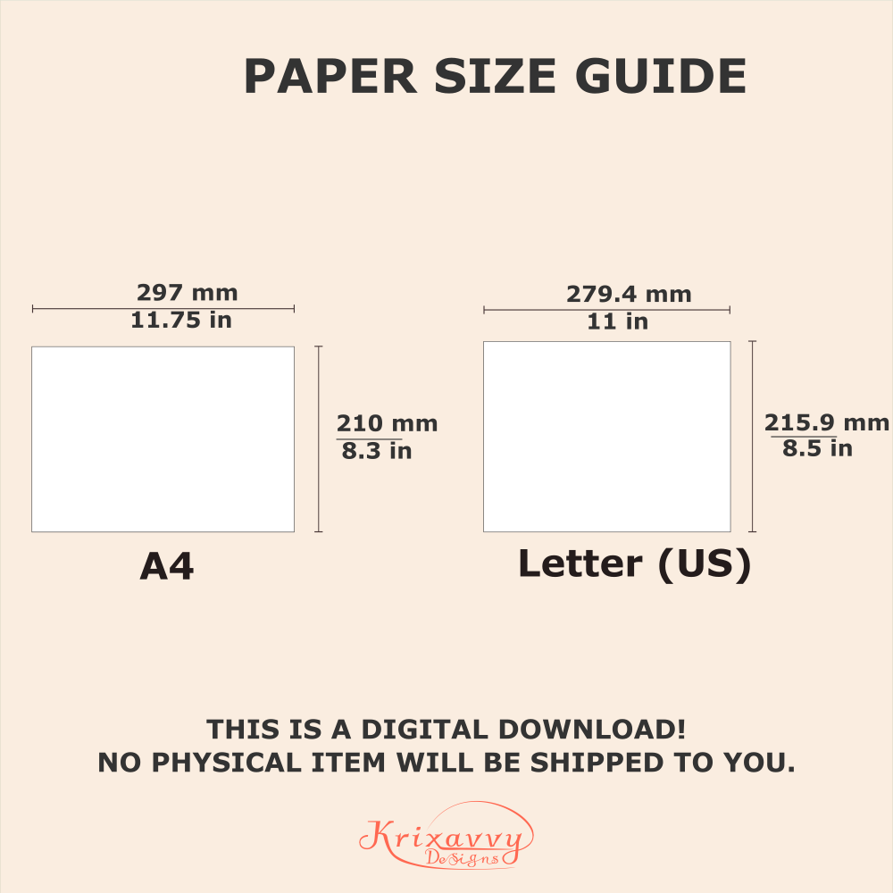 You will receive 2 ZIP Files (A4 and US Letter size); each ZIP file contains 8 PDF Files (Sunday and Monday start; Lined with date container, lined, Unlined with date container and blank)