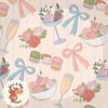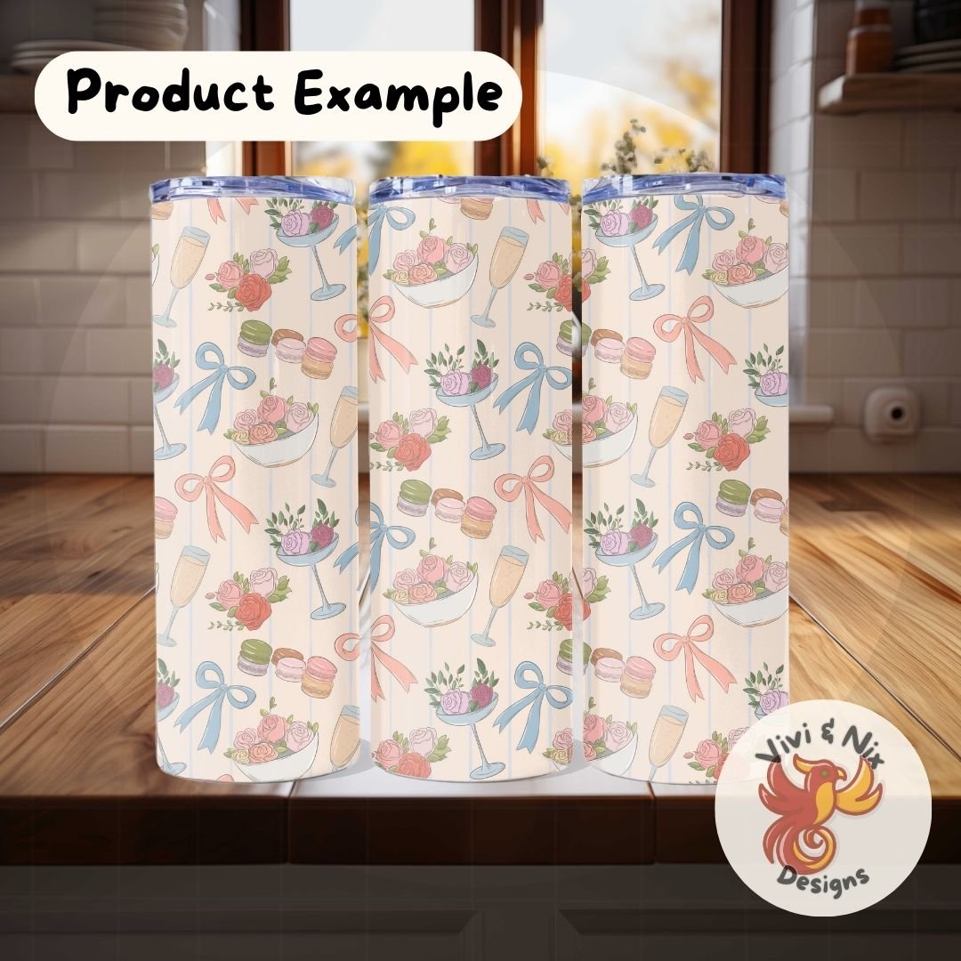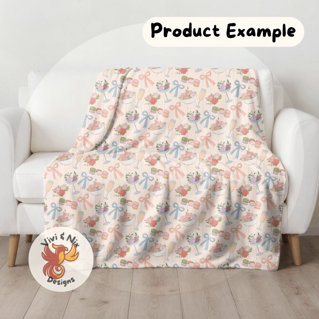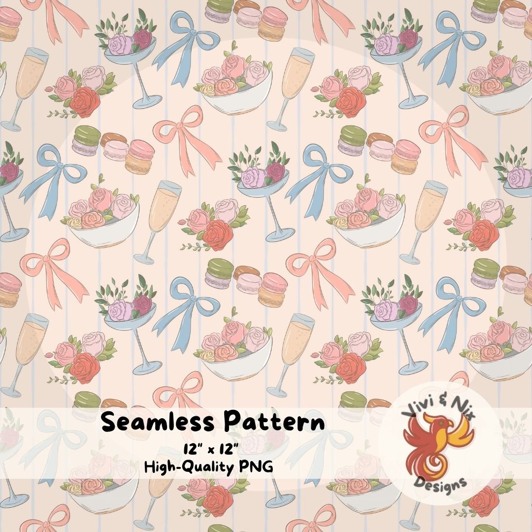 This elegant Blush Brunch seamless pattern features hand-drawn florals, bows, champagne glasses, and pastel macarons arranged on a soft striped background. Designed with a refined, feminine feel—perfect for adult-focused projects, celebrations, and boutique designs.