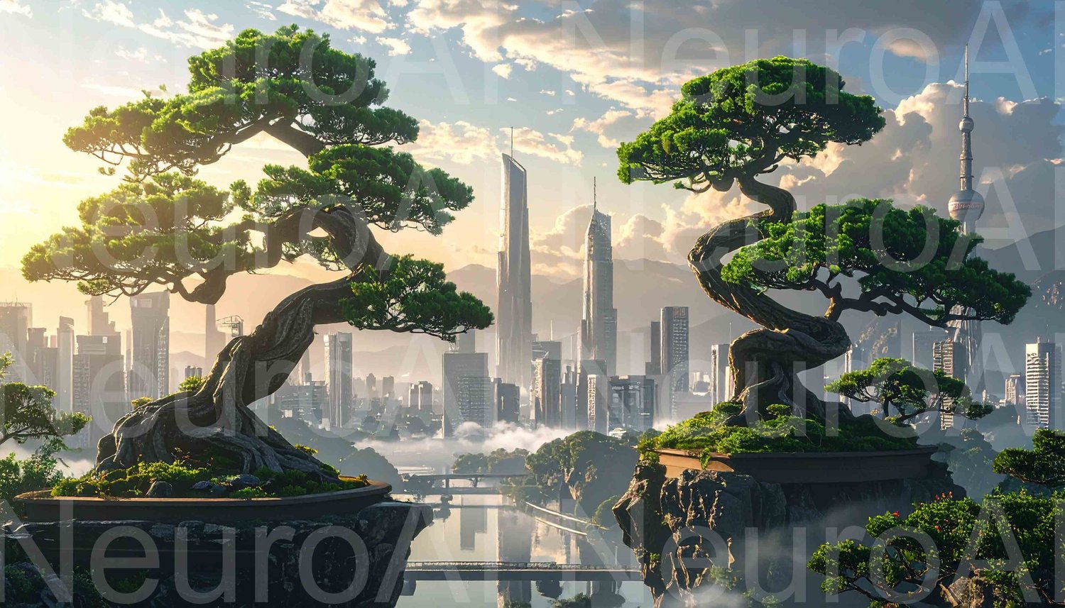 Serene bonsai trees overlook futuristic city skyline at dawn