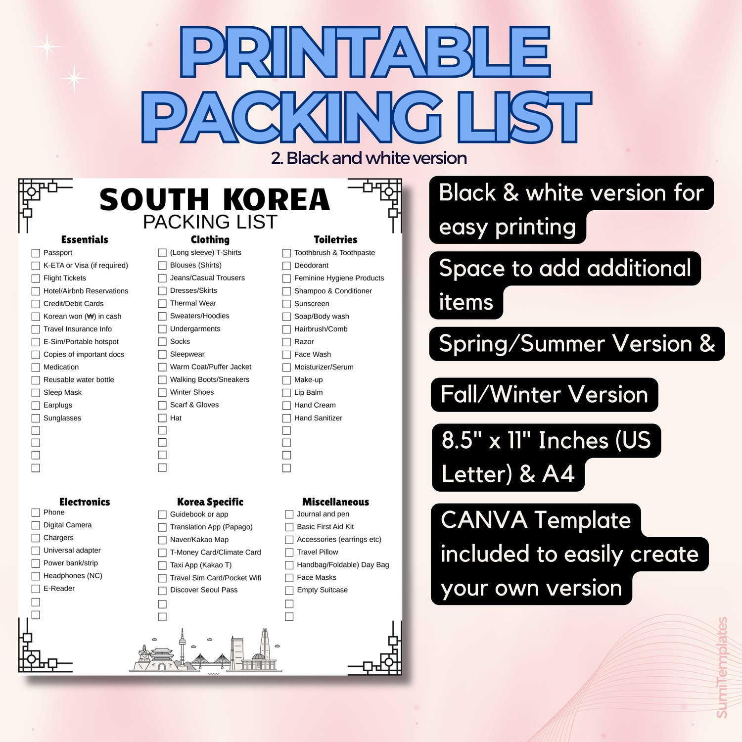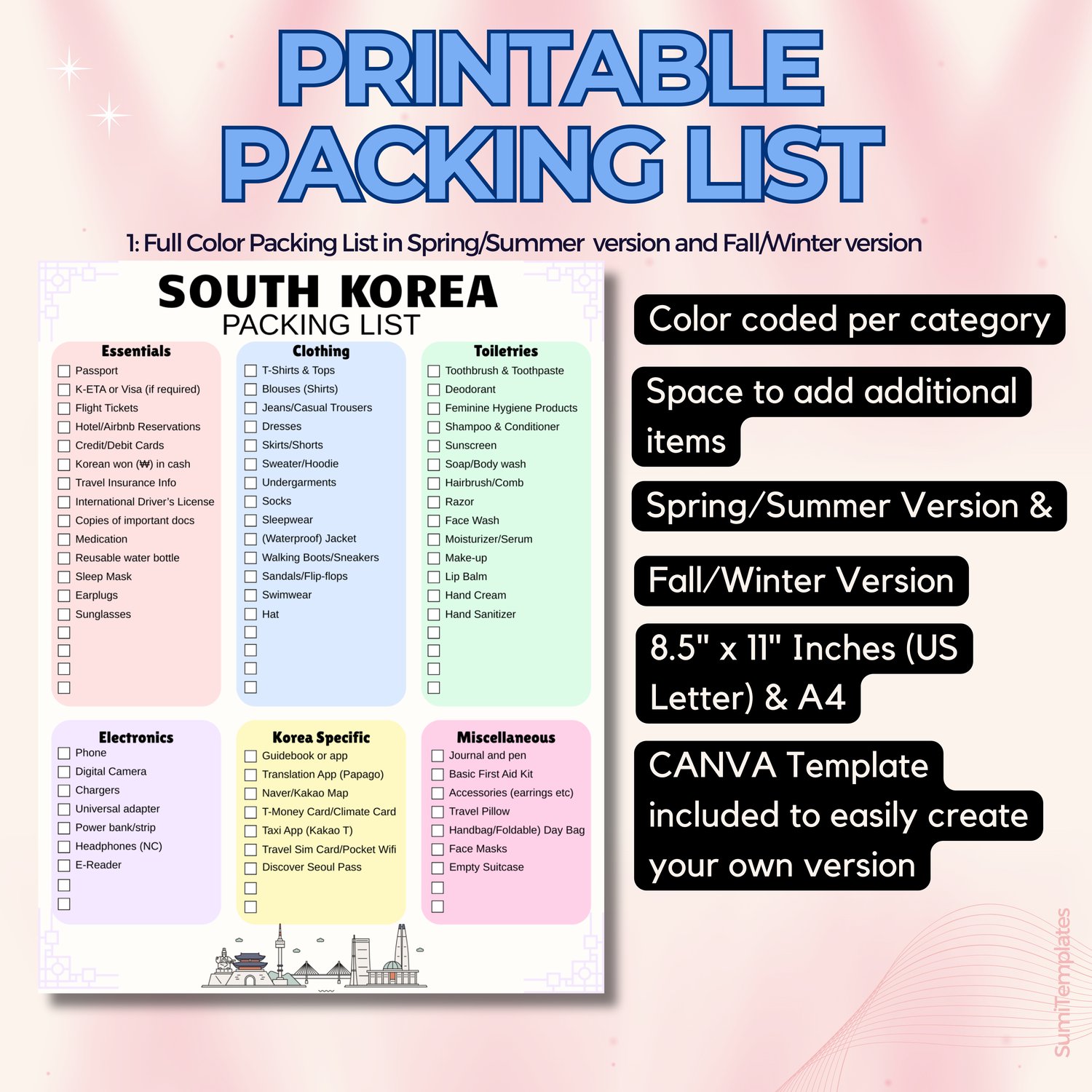 Plan your South Korea adventure in style with our easy to use color-coded Korea packing list. Streamline your travel preparations with our one-page list, designed to capture all your travel essentials for the trip of a lifetime. This unique item is a must for those who wish to keep their trip and suitcase organized and easy.