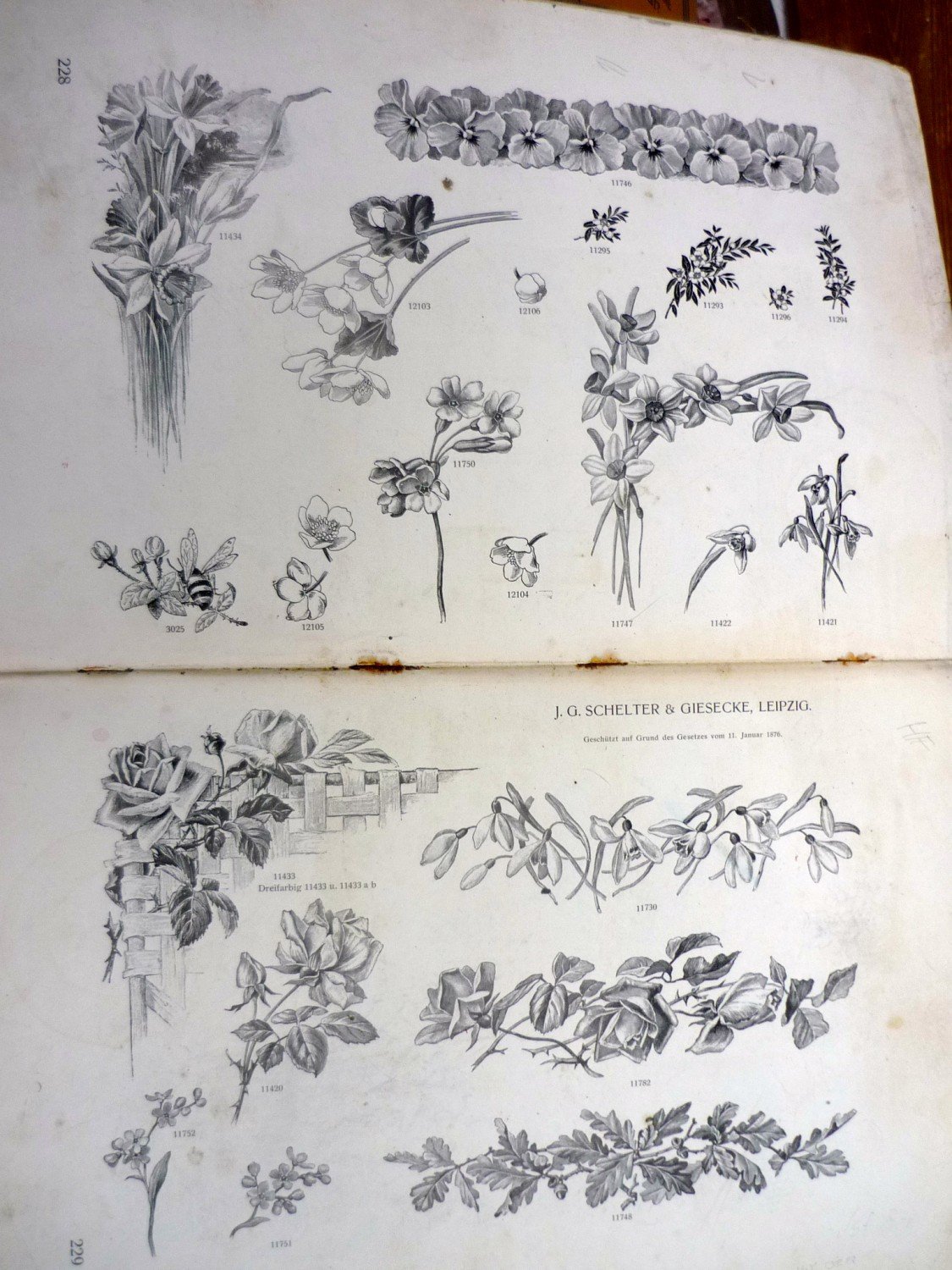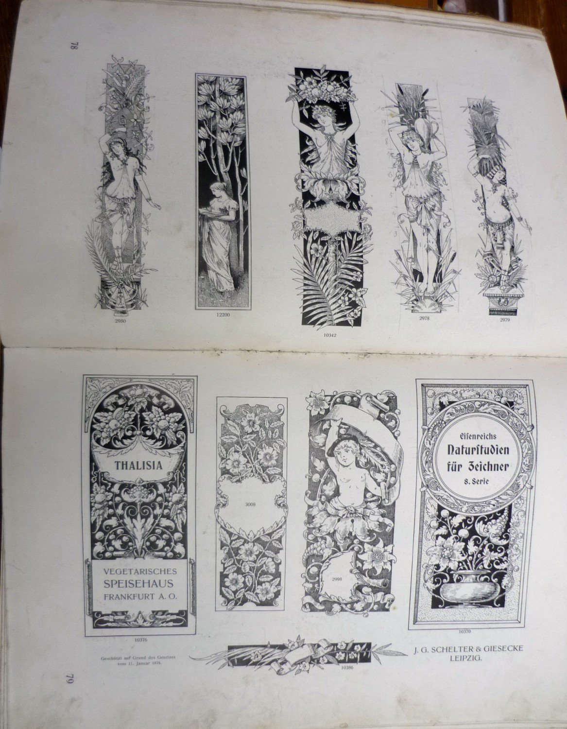 This encyclopedic specimen book of the Leipzig type foundry and printing supply house J.G. Schelter & Giesecke features, as the title indicates, all kinds of decoration for supplying printing of every type. On the title page, the firm boasts of winning a grand prize in 1900 in Paris (presumably at the Exposition Universelle). It is hard to do justice in a short description to the variety of styles (traditional, Jugendstil, etc.) and categories (certificates, letterheads, borders, ornaments, exotic motifs, flowers, animals, silhouettes, menus, greeting cards, vignettes humorous and otherwise, images of bicyclists, occupational symbols, portraits, Classical figures, religious art, heraldry, ships, trains, athletes, etc. offered in this volume. Some of the examples are printed in colour but most are in black and white. .