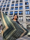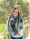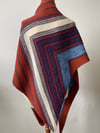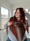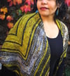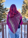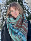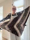 While the Imprint Cowl invited us to reflect on memories that left an impact on us, the Transitory Wrap reminds us that for better or worse, everything changes. If you stay the course and make it through the situation you’re in, something new will come. This is a large kite-shaped wrap full of visual interest, featuring bold color blocks and mindful stitches. It is an almost blanket-sized friend asking you to spend time with them in the present.