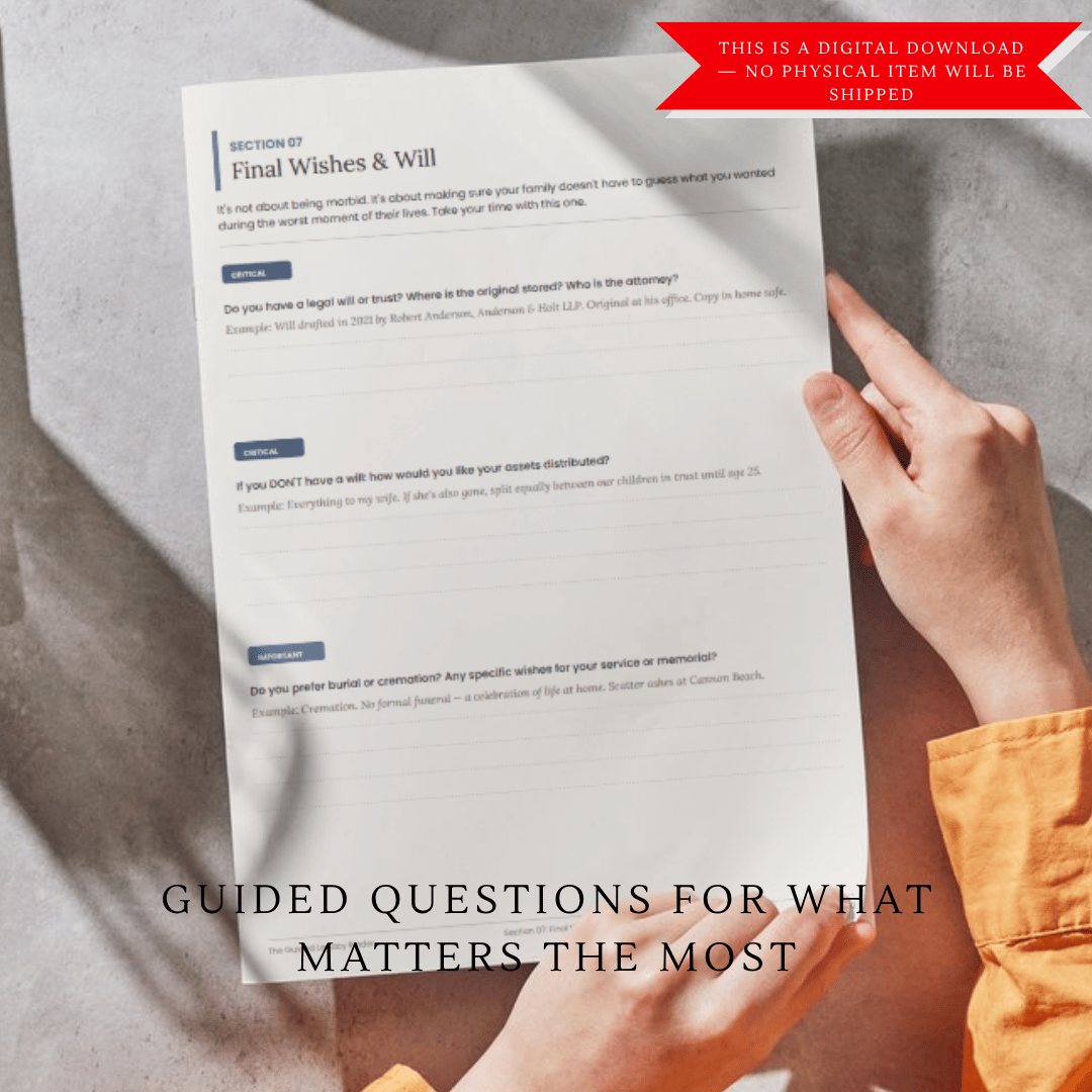 ☑ 8 complete sections covering personal info, emergency contacts, finances, insurance, property, health, final wishes, and a 72-hour crisis action plan