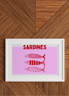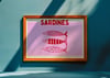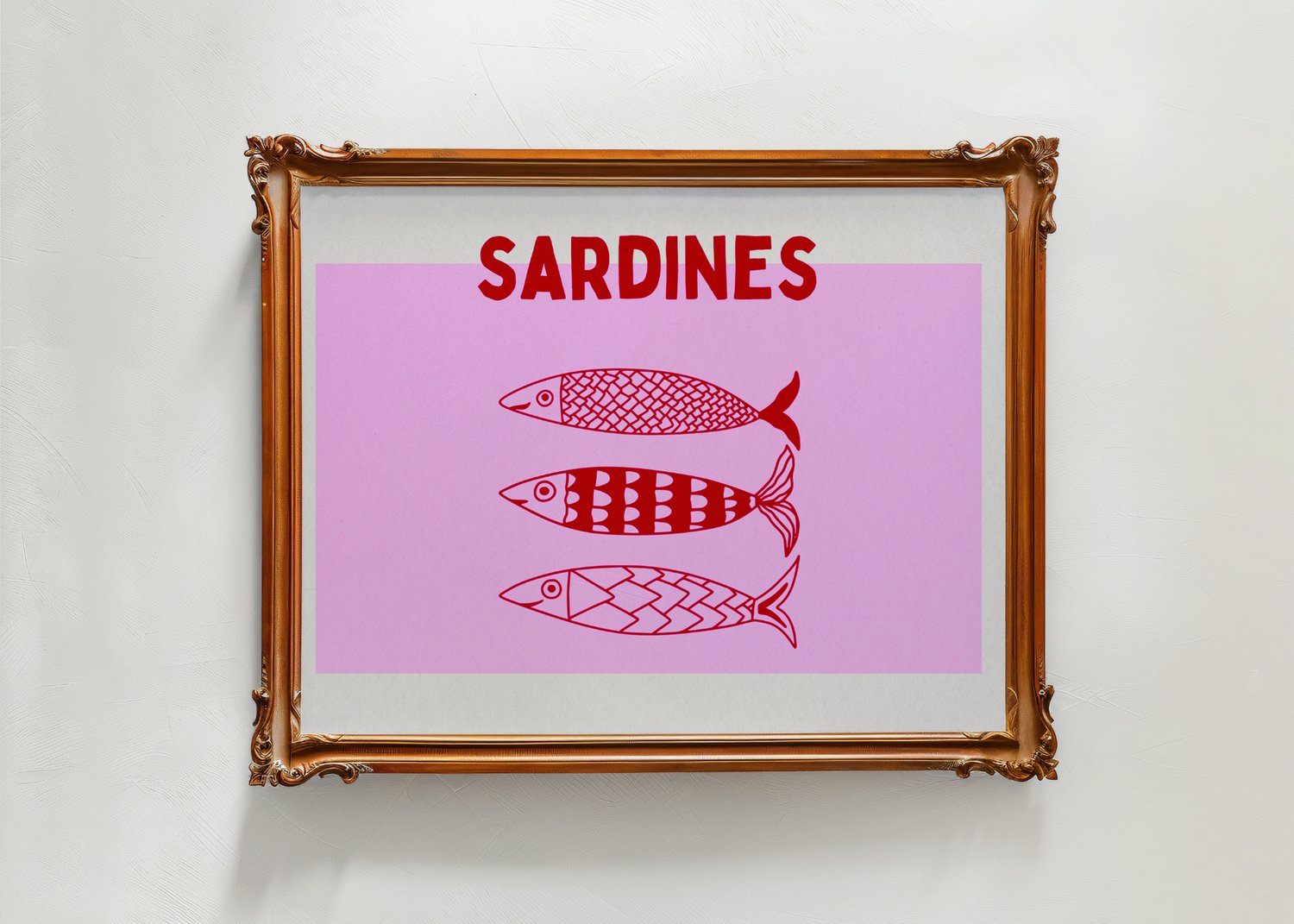 Pink Sardines— With a punch of playful nostalgia, on a pink background with dark pink accents, this print feature three fun fish illustrations stacked vertically beneath the word "Sardines" in bold block letters. Whimsical and slightly weird in all the right ways.