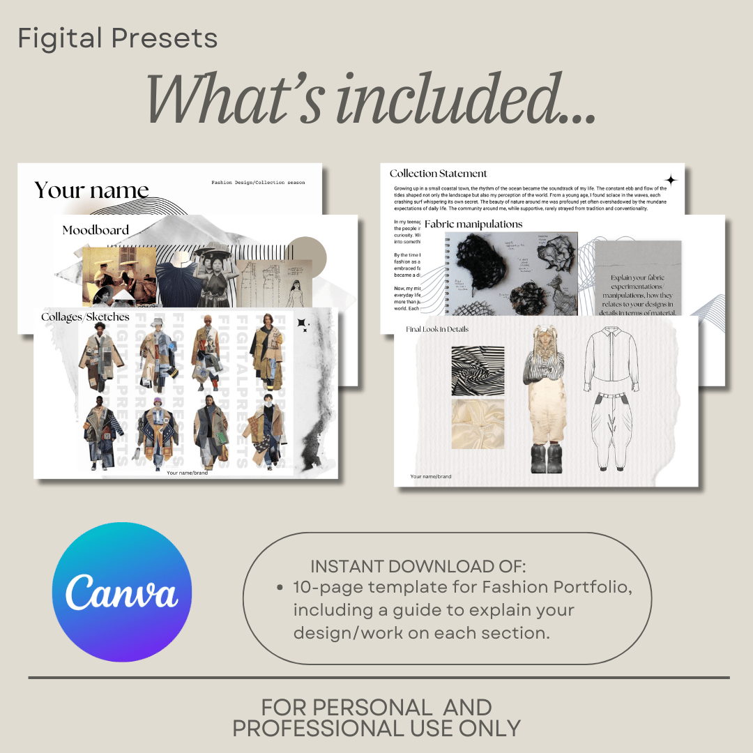 11-page template for Fashion Portfolio, including guide to explain your design/work on each section.