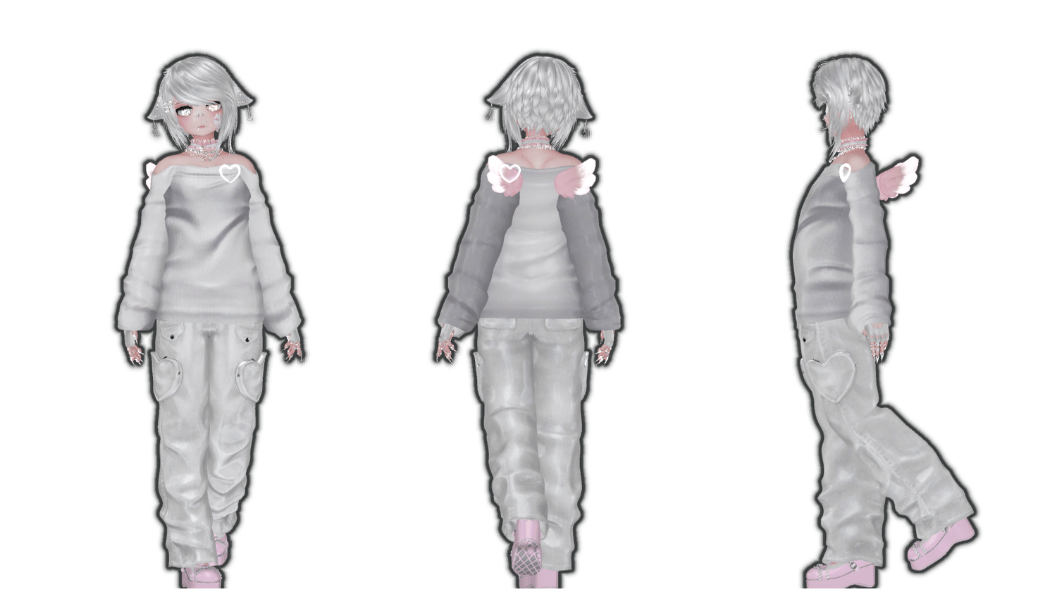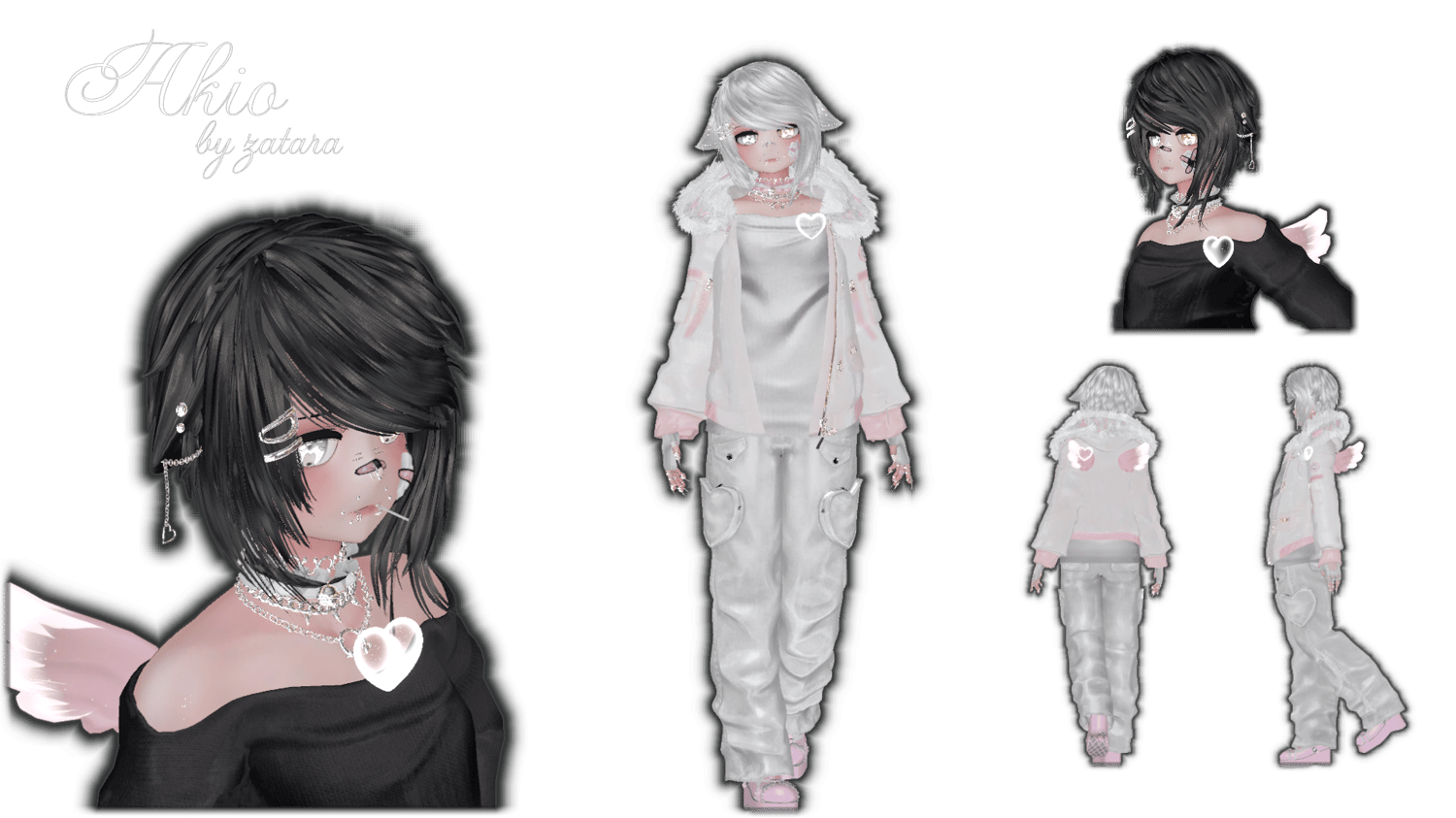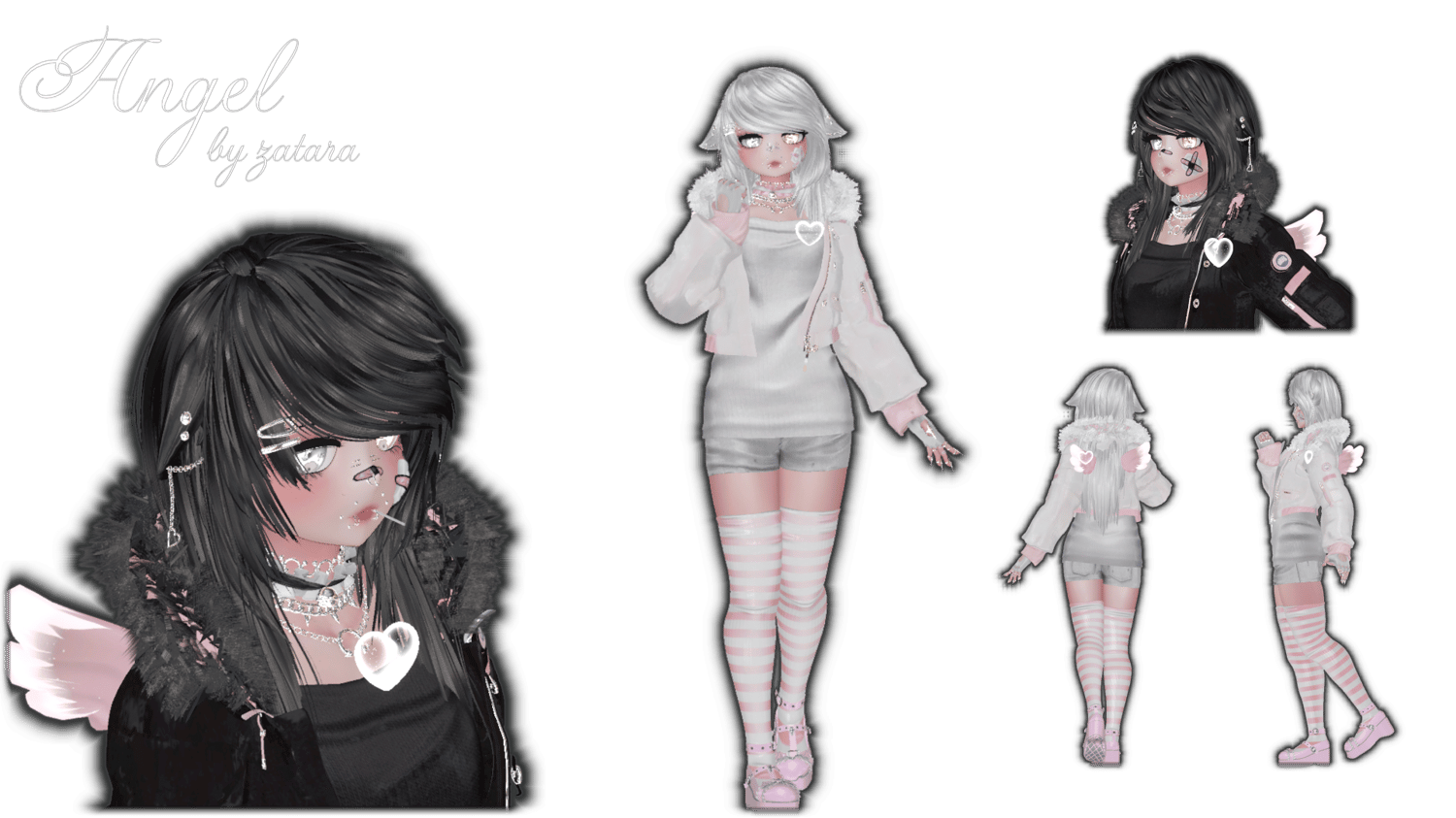 Jacket | Claws | Collar | Cheek Bandaid | Nose Bandaid | Finger Bandaids | Glasses | Gloves | Lollipop | Necklace 1 | Necklace 2 | Necklace 3 | Rings | Wings | Ears | Bangs Swap | Heart | 5 Hair Colors | Black to white swap | Hue Shift | Gogo Loco