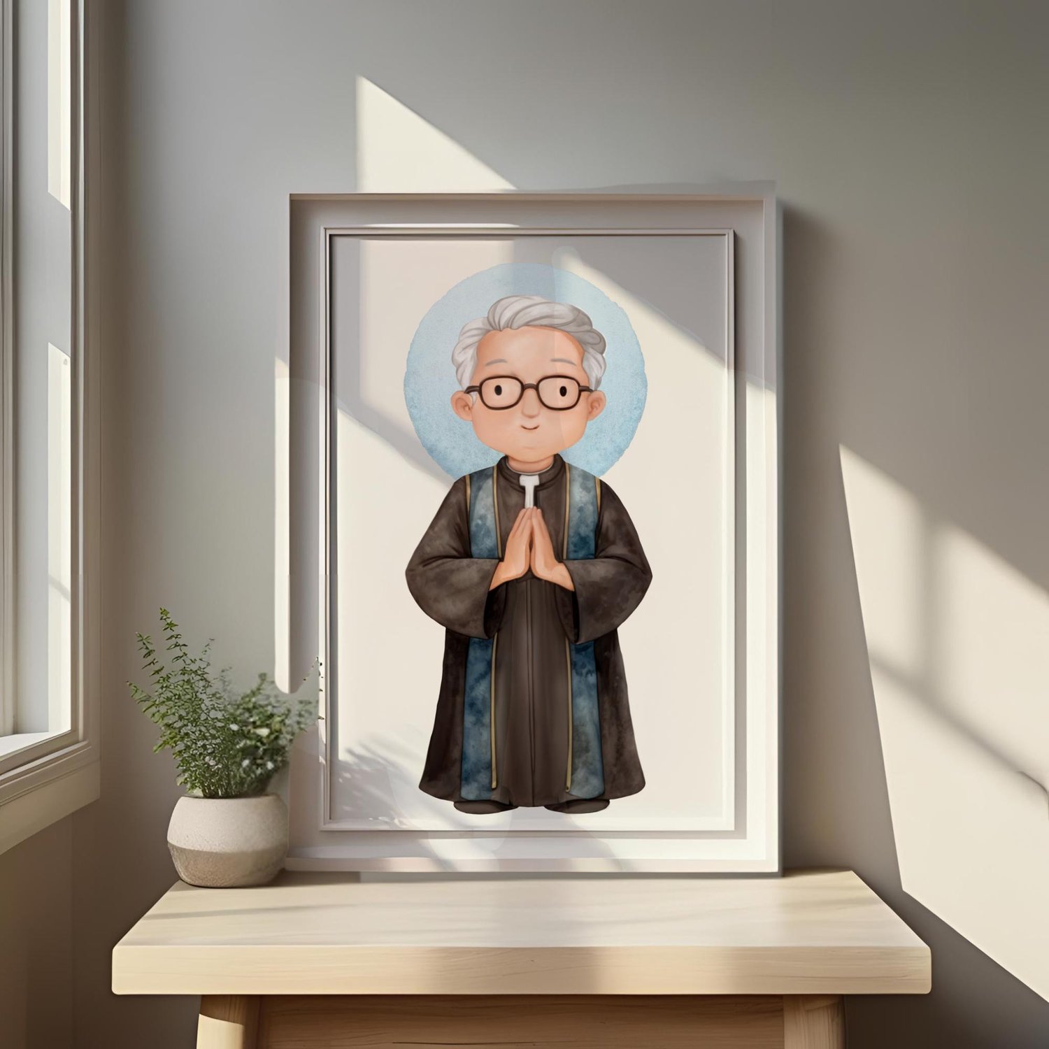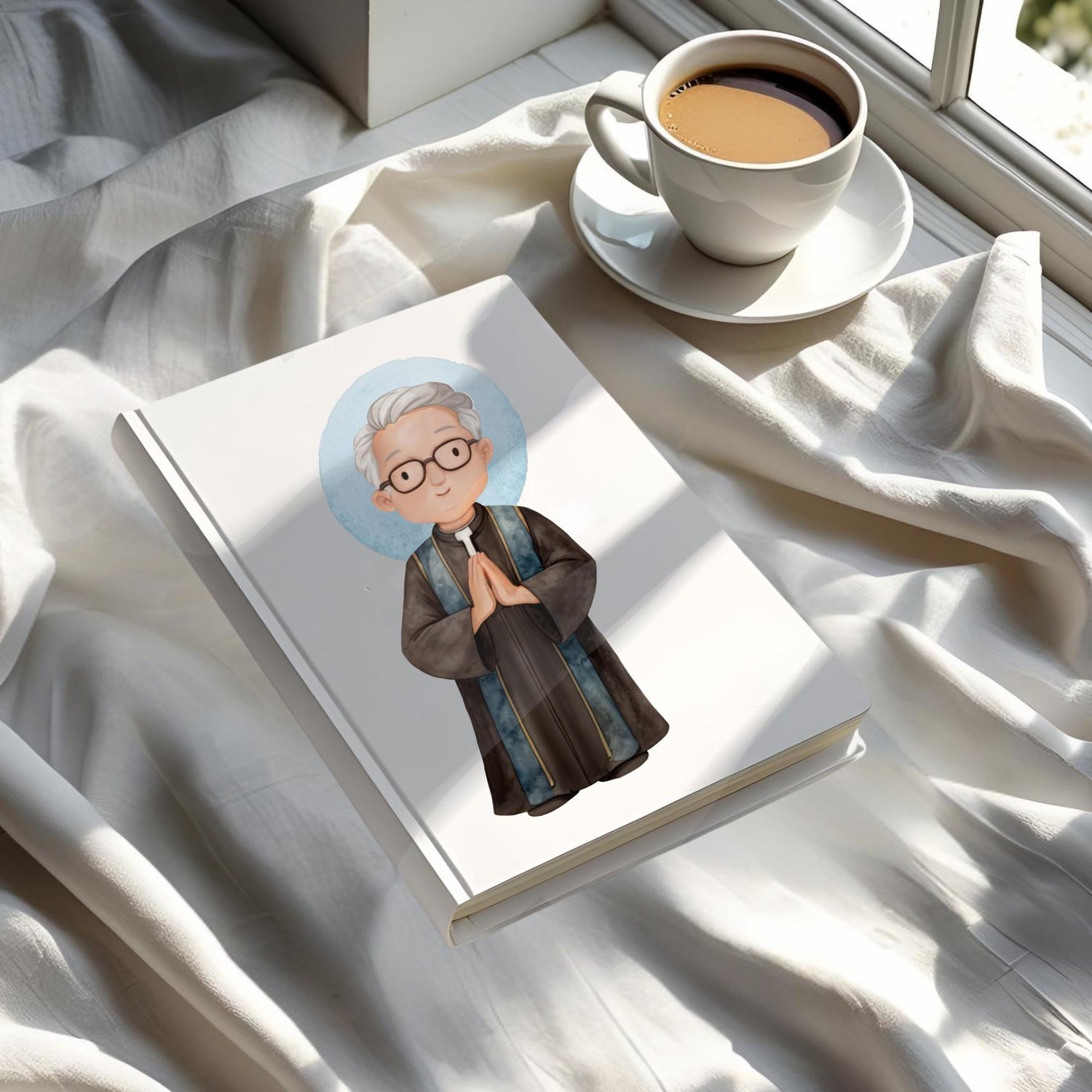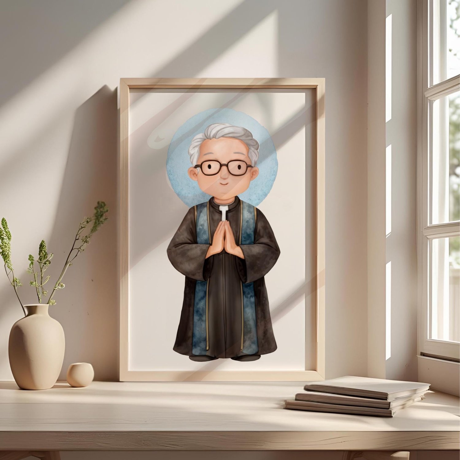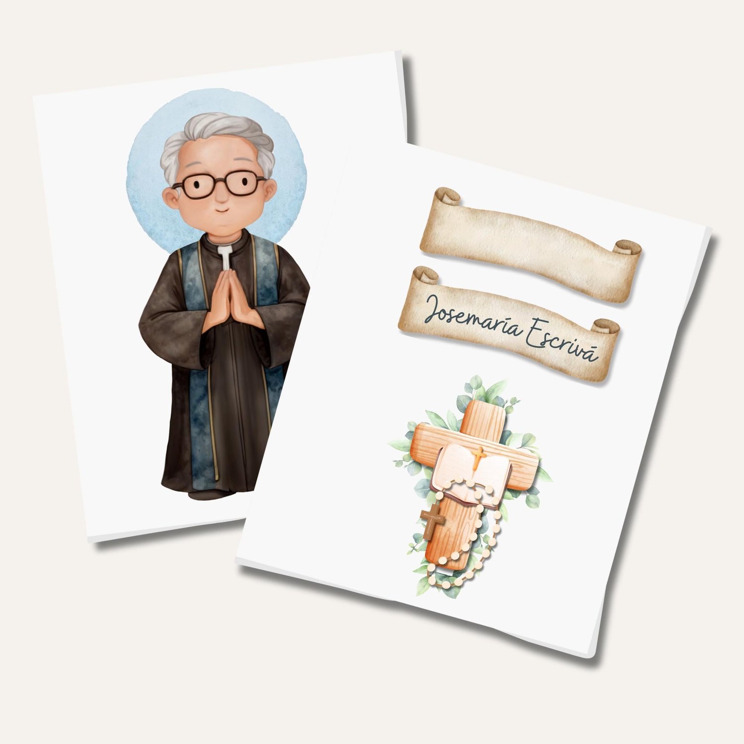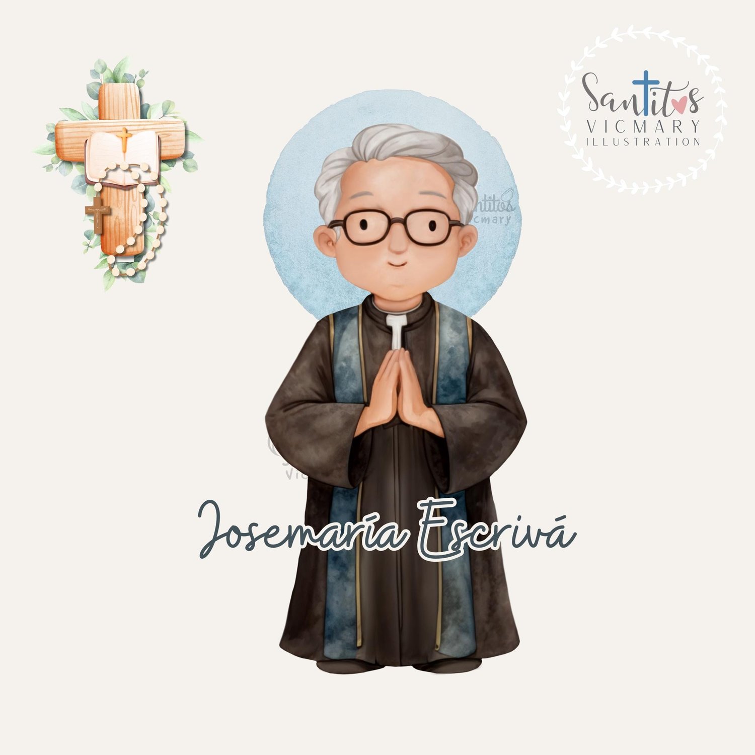 • 1x Ilustración principal de Josemaría Escrivá . Una imagen completa del personaje en un estilo dulce y moderno. Ideal para invitaciones, estampitas, posters, y más.
