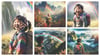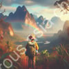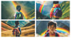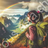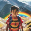 The adventurous asia child, backpack, centered, big rainbow covered mountains in the background, Nature-shot, eye level, soft light