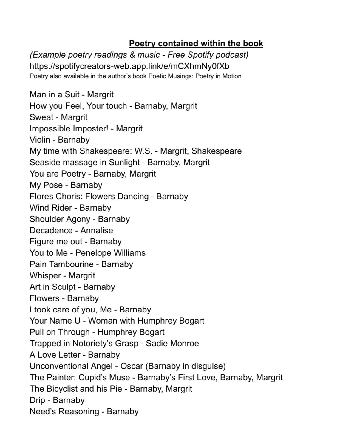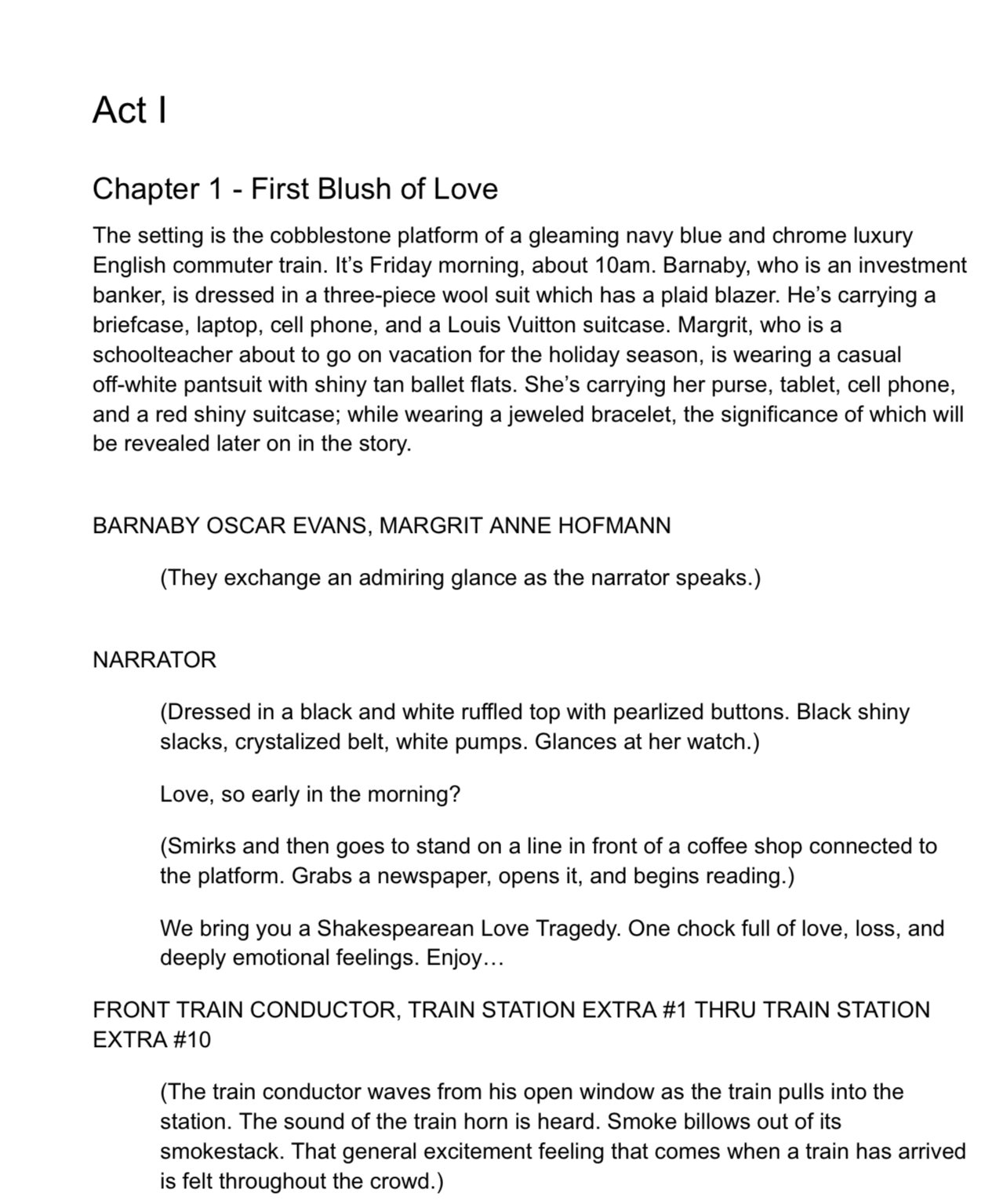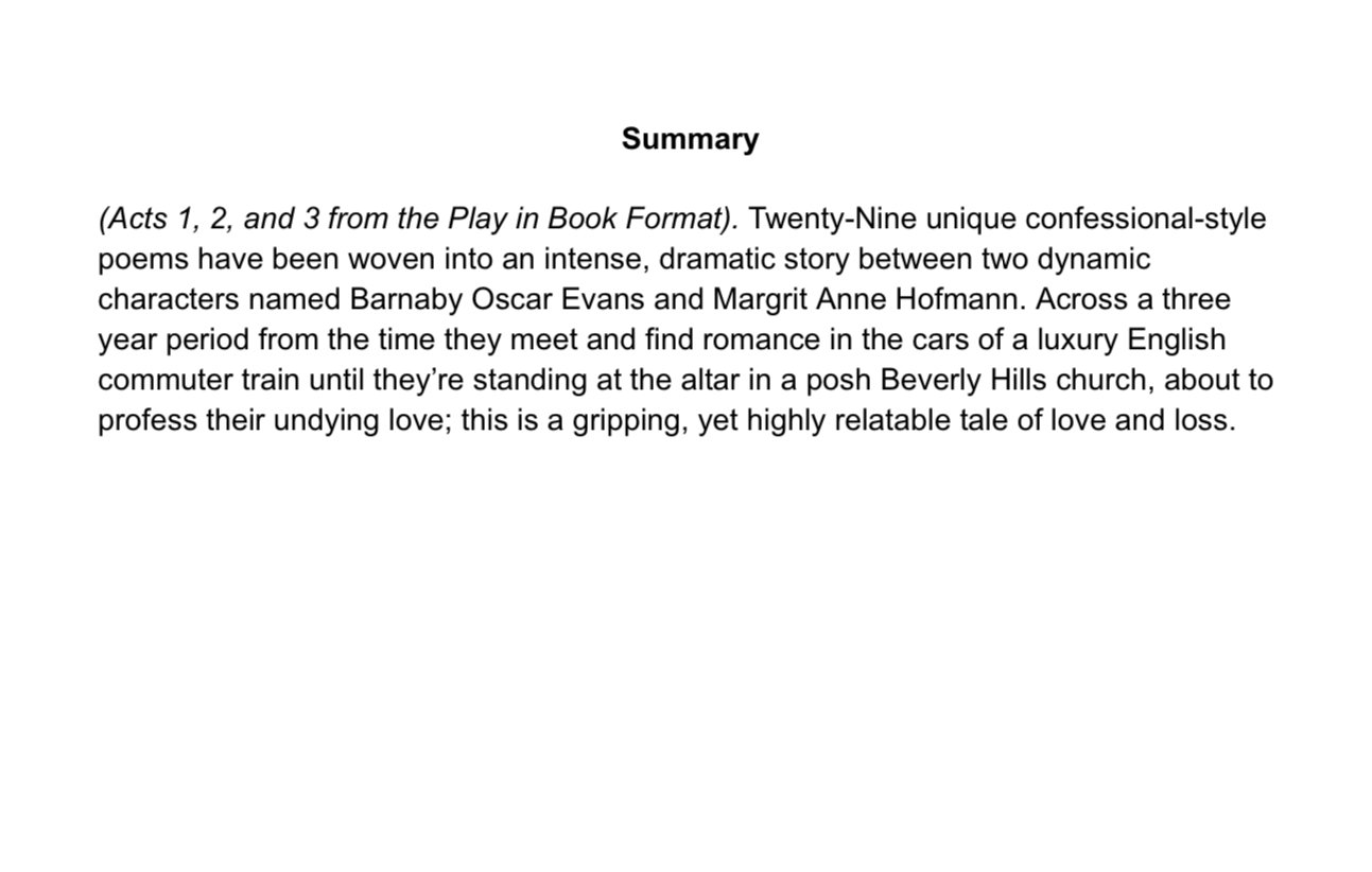 (Acts 1, 2, and 3 from the Play in Book Format). Twenty-Nine unique confessional-style poems have been woven into an intense, dramatic story between two dynamic characters named Barnaby Oscar Evans and Margrit Anne Hofmann. Across a three year period from the time they meet and find romance in the cars of a luxury English commuter train until they’re standing at the altar in a posh Beverly Hills church, about to profess their undying love; this is a gripping, yet highly relatable tale of love and loss.