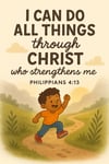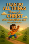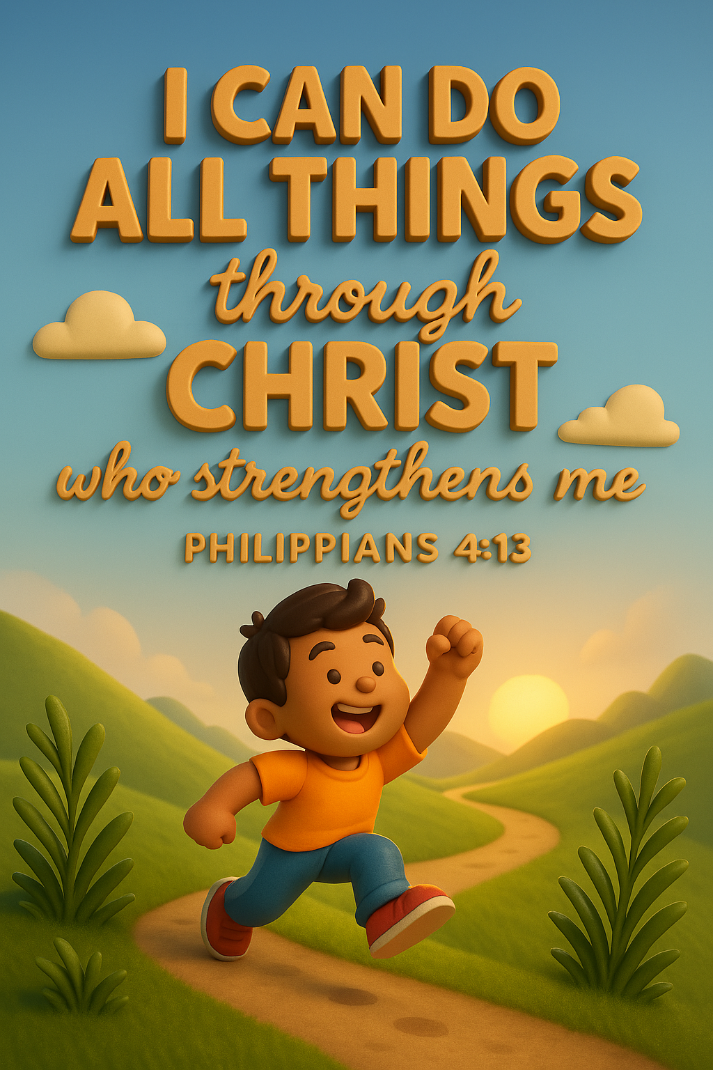Vibrant 3D-style illustrations of a child running freely along a winding path, set against a lush mountain landscape. The bold declaration “I CAN DO ALL THINGS through CHRIST who strengthens me” (Philippians 4:13) is rendered in a mix of bold and cursive fonts, emphasizing movement, strength, and divine empowerment. Available in both 2D and 3D formats for versatile display.