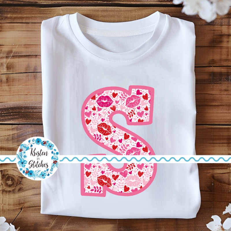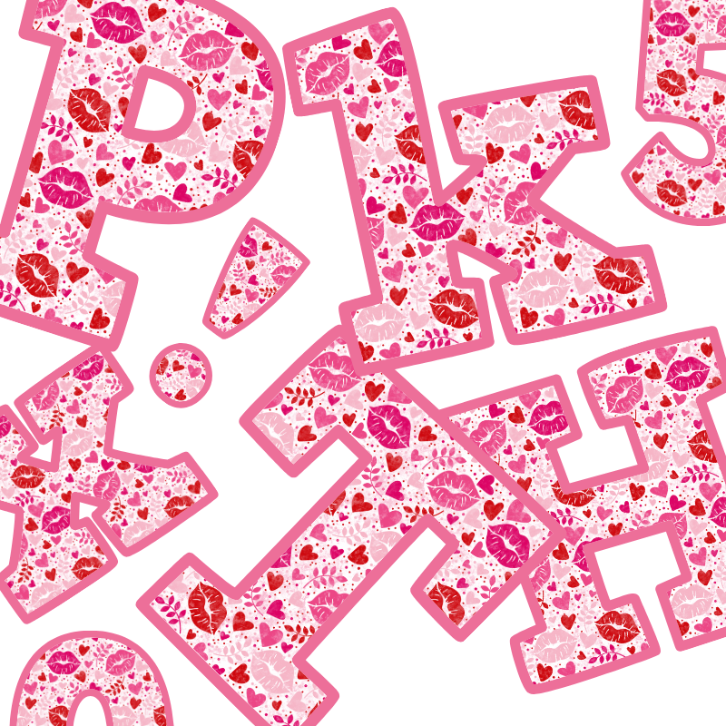 Sweetheart kisses and hearts alphabet in pink and red. This set includes uppercase letters A-Z and numbers 0-9 and common symbols. See photo for a visual of the letters and numbers.