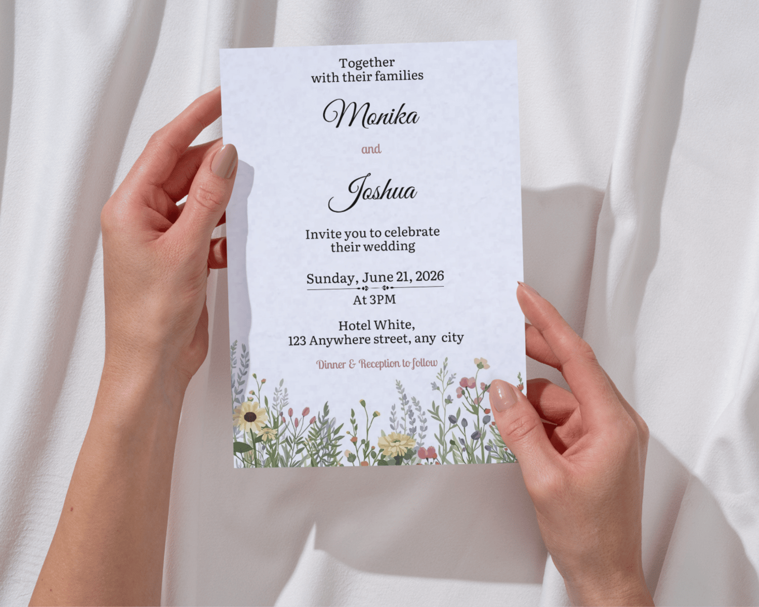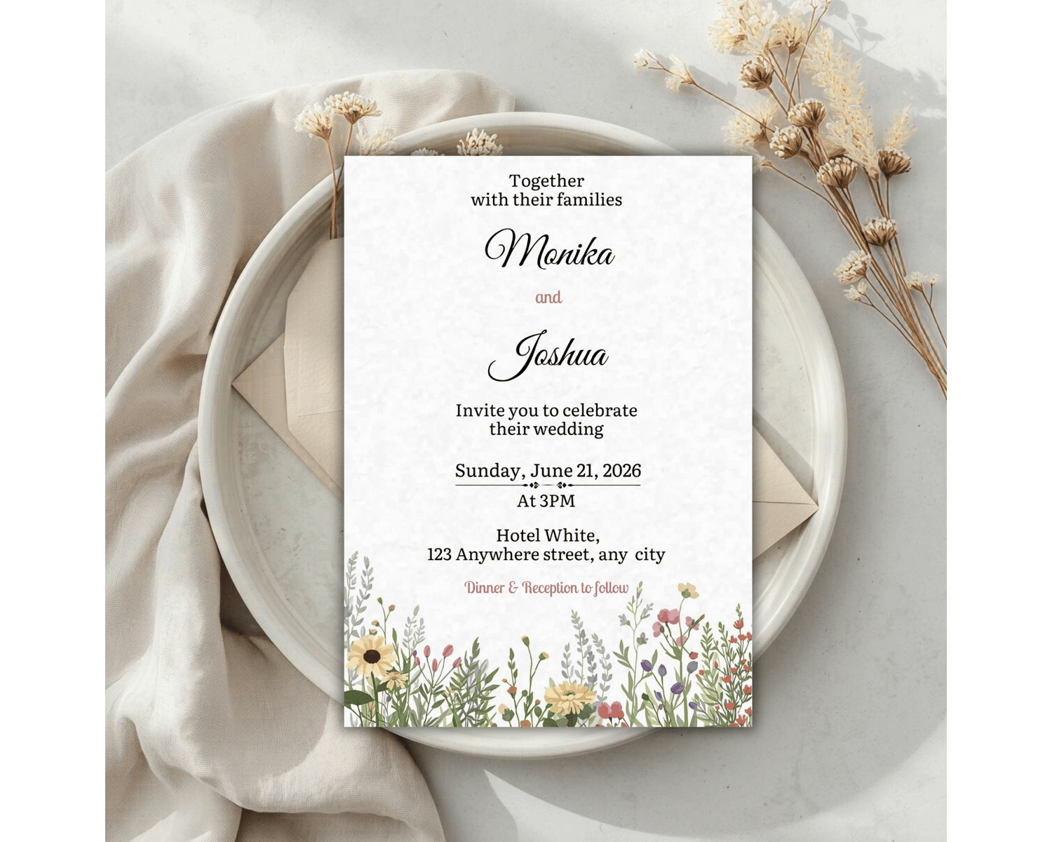 Create a beautiful and elegant wedding invitation in minutes with this modern floral design. Perfect for couples who love a clean, minimal style with soft wildflower details.