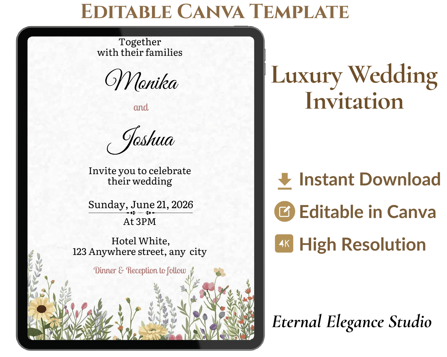 This is a fully editable Canva template, so you can easily customize names, date, time, venue and all details directly from your phone or laptop — no design skills needed!
