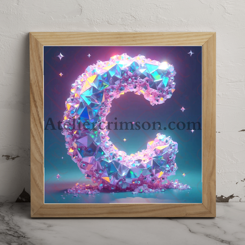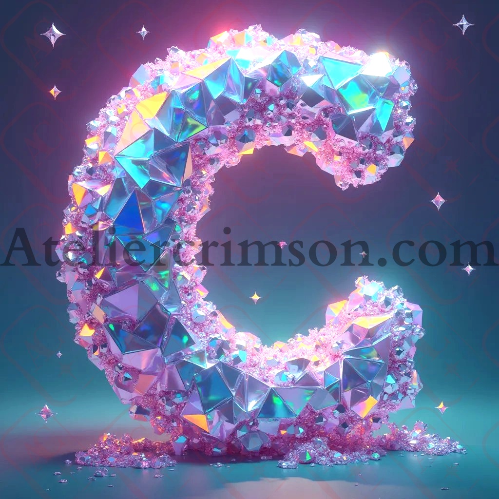 The letter C crystalline Retro Futuristic C A unique creation blending retro-futuristic aesthetics and geometric elegance. Each character is sculpted from iridescent crystals in vibrant, nostalgic hues, set in delicate silver filigree. Against a gradient background transitioning from deep purple to teal blue, this digital artwork captures the essence of 80s-inspired digital art with a touch of crystalline luxury. Perfect for typography enthusiasts, digital art lovers, and those who appreciate retro-futuristic aesthetics.