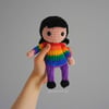 Raina the Rainbow Doll is a plush amigurumi doll pattern wearing a multicolored shirt. This sweet crochet pattern is easily customizable with different colors — perfect for Pride, sports teams, school mascots, and more. Designed with soft plush yarn, it’s a cuddly size for children, or you can use thinner yarn to create a cute keychain. Beginner-friendly and low-sew, it features a no-sew body (you only need to attach the hair cap), making it quick and easy for last-minute gifts, craft fairs, or personalized creations. Customize your doll’s body, skin tones, and accessories for endless possibilities!