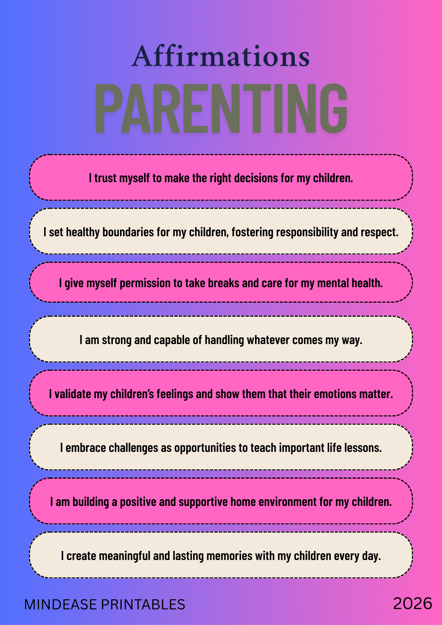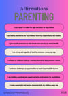 💕 Parenting Affirmations Empower yourself as a parent with 8 powerful affirmations on a stunning blue-to-pink gradient background. Includes affirmations like "I trust myself to make the right decisions for my children," "I set healthy boundaries for my children, fostering responsibility and respect," and "I am building a positive and supportive home environment for my children." Perfect for mindful parenting and self-compassion.