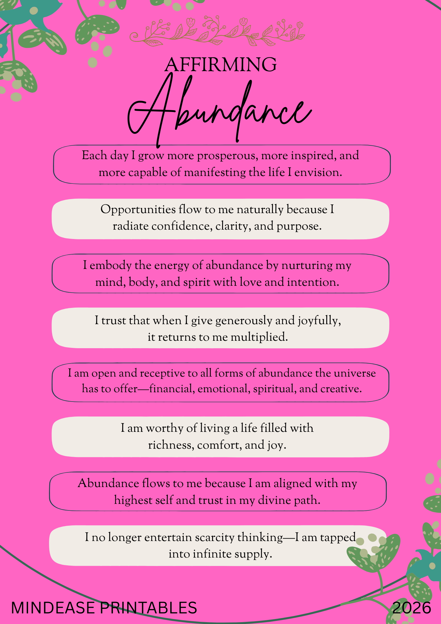 ✨ Affirming Abundance Attract prosperity and wealth with 8 abundance affirmations on a vibrant pink background with botanical elements. Features affirmations such as "Each day I grow more prosperous, more inspired, and more capable of manifesting the life I envision," "Opportunities flow to me naturally because I radiate confidence, clarity, and purpose," and "I am open and receptive to all forms of abundance the universe has to offer—financial, emotional, spiritual, and creative." Manifest your dreams!