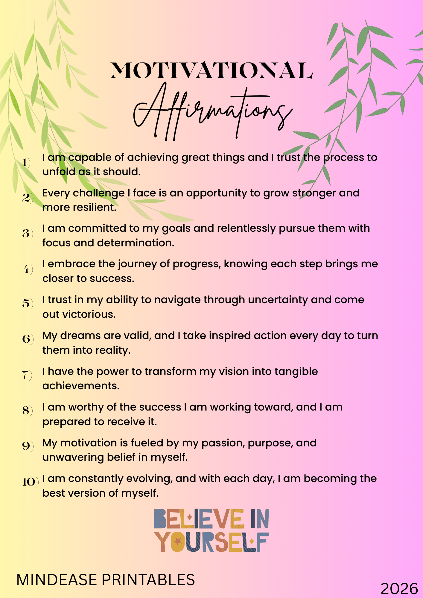 🌟 Motivational Affirmations Fuel your success with 10 numbered motivational affirmations on a yellow-to-pink gradient with botanical accents. Includes powerful statements like "I am capable of achieving great things and I trust the process to unfold as it should," "Every challenge I face is an opportunity to grow stronger and more resilient," and "I am constantly evolving, and with each day, I am becoming the best version of myself." Features inspiring "BELIEVE IN YOURSELF" message.