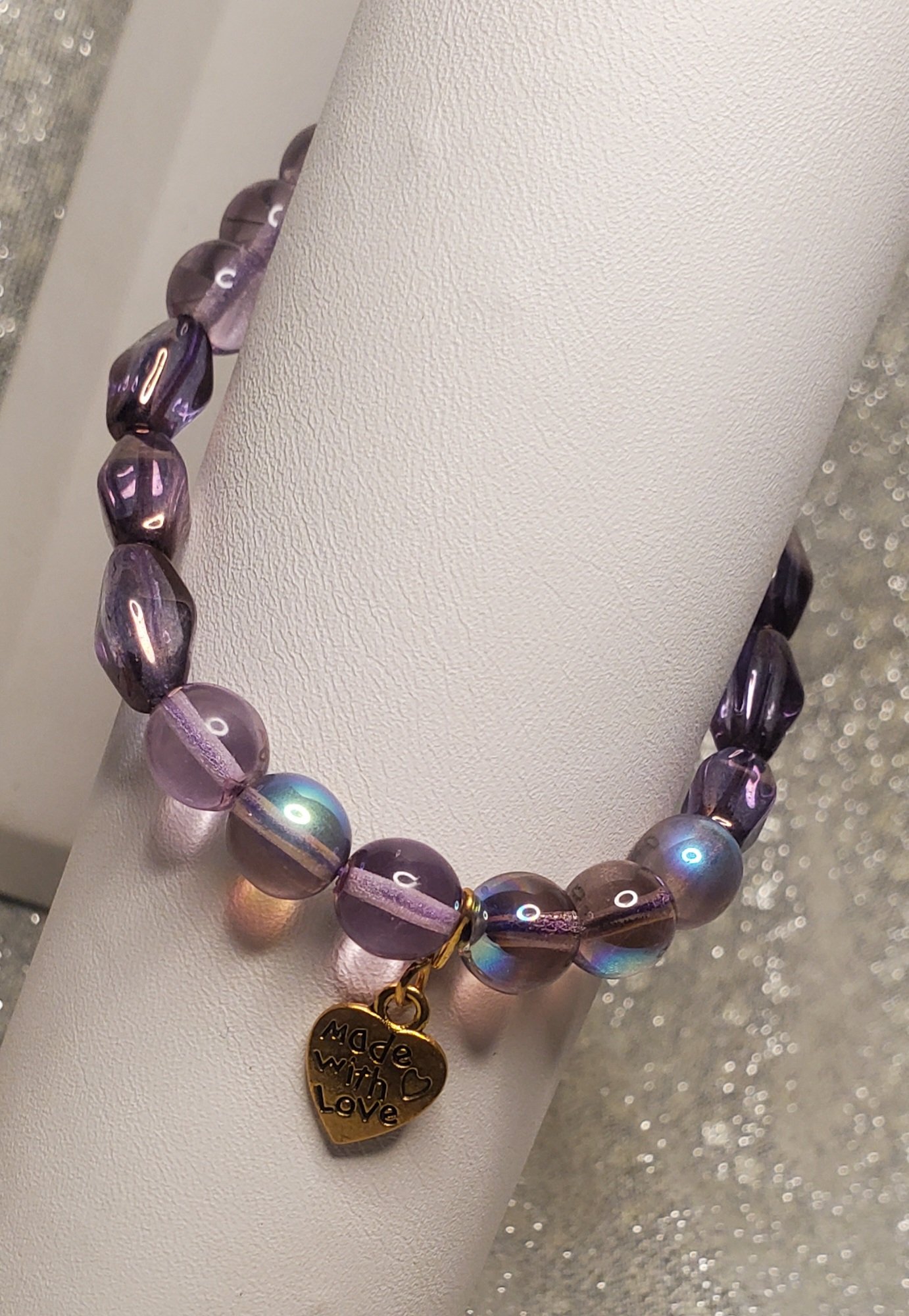 📦Purple Mix Glass Bead Charm Bracelet #PMSB8