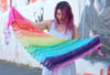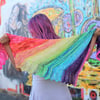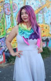 The neon rainbow model is the size Small and the more autumn/water colored shawl is the Large. The Small model contains 16 different fingering weight yarn scraps, and the large model contains 21 different fingering weight yarn scraps.