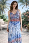Ne cherche plus ! Cette robe longue au motif paisley dans les tons bleu, blanc et rouge est la pièce bohème-chic parfaite pour cet été 🌞