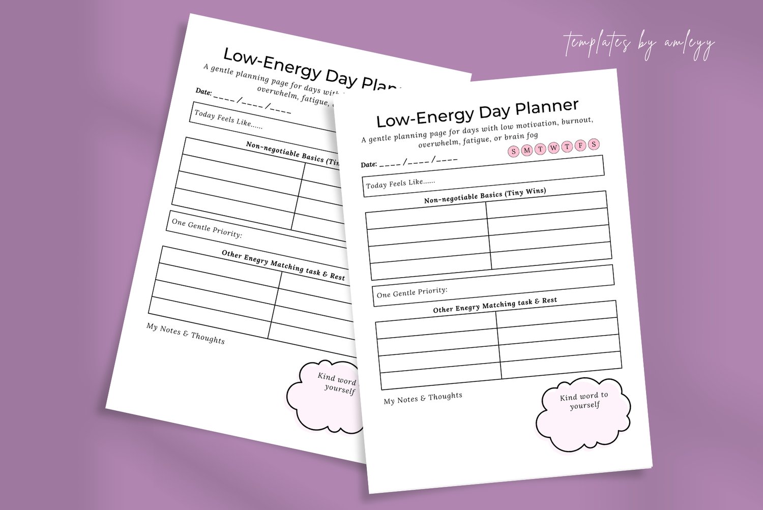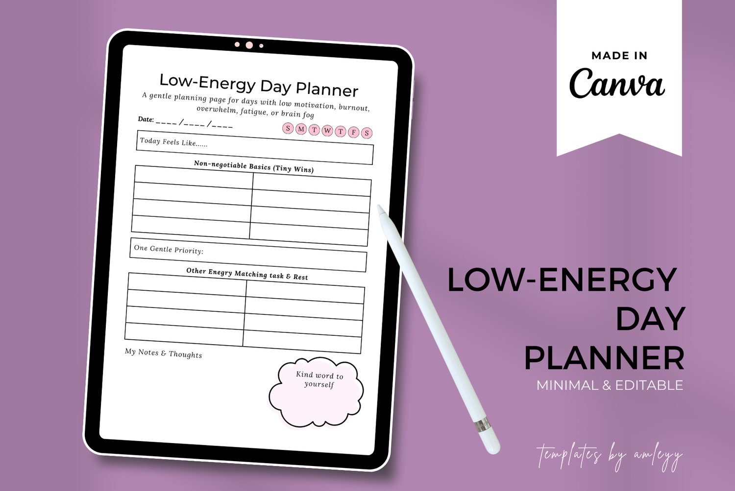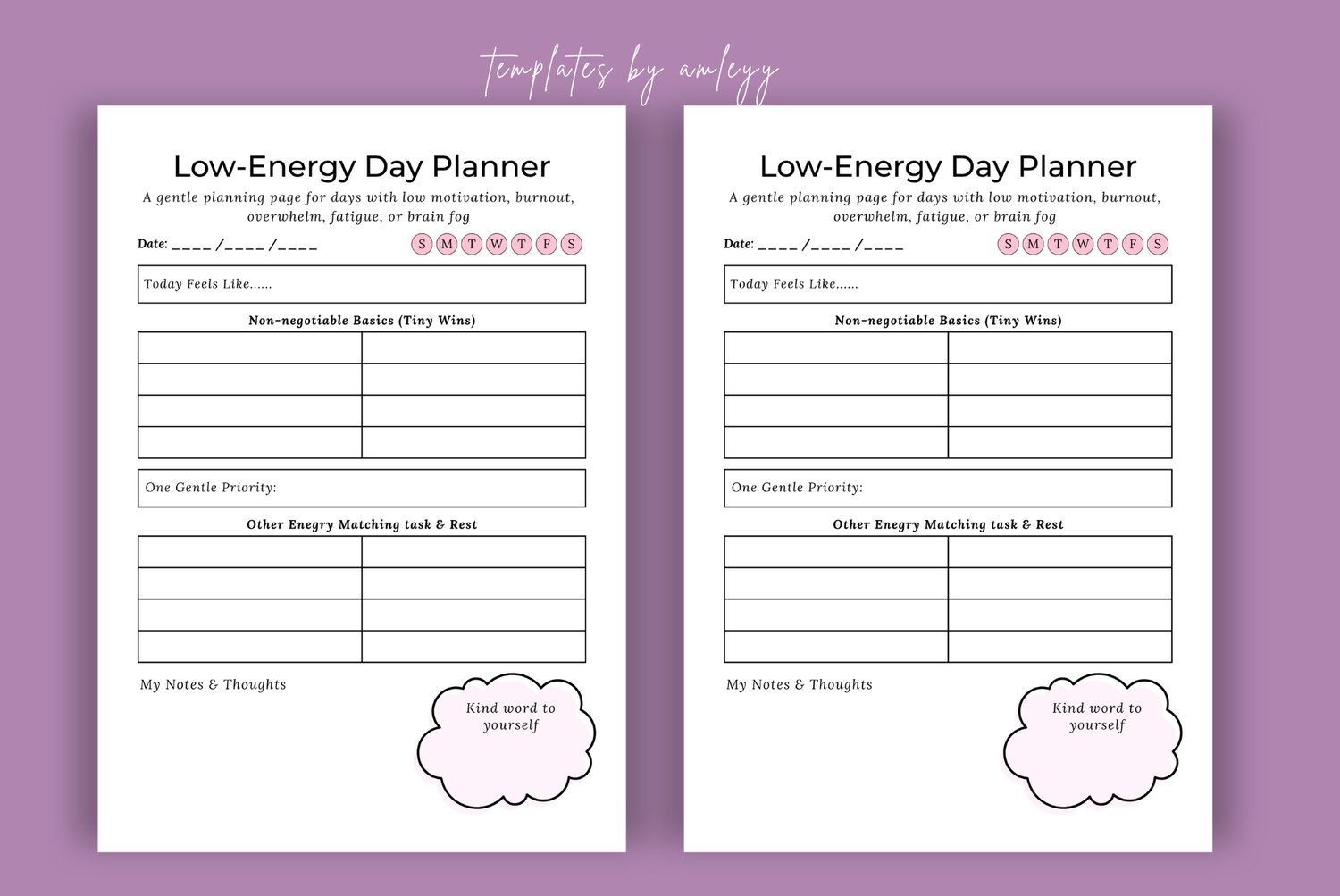 Some days, a standard "hustle" planner feels impossible. Our Low-Energy Day Planner is designed for those days when your physical or mental battery is running low. Instead of a 20-item to-do list, this template focuses on pacing, self-care, and "bare minimum" wins.