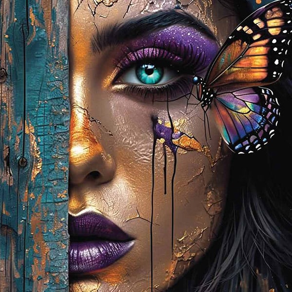 A striking digital artwork exploring the beauty found in brokenness. This piece symbolizes strength, transformation, and the journey of healing — featuring cosmic textures, cracked gold, and a butterfly of rebirth.