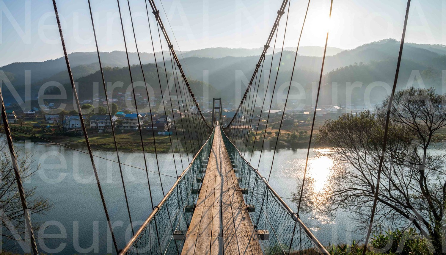 Suspension bridge crosses tranquil river valley