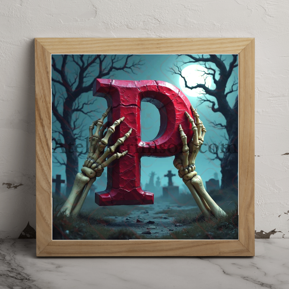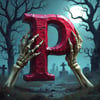 The letter P ruby halloween skull Discover our eerie alphabet series featuring photorealistic ruby letters and numbers. Each character, crafted from deep red gemstone, floats mysteriously in a misty graveyard. Skeletal hands frame these gleaming symbols against a moonlit, Halloween-inspired backdrop. Perfect for gothic design projects or seasonal decor inspiration!