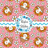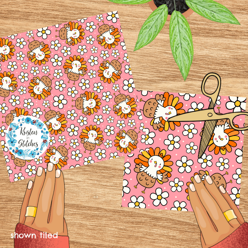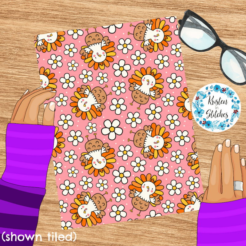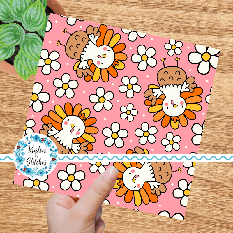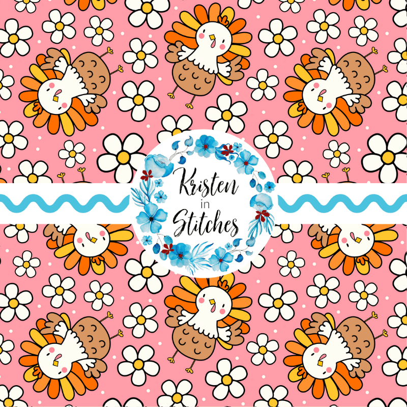 Sweet little turkeys and daisy flowers on pink.
