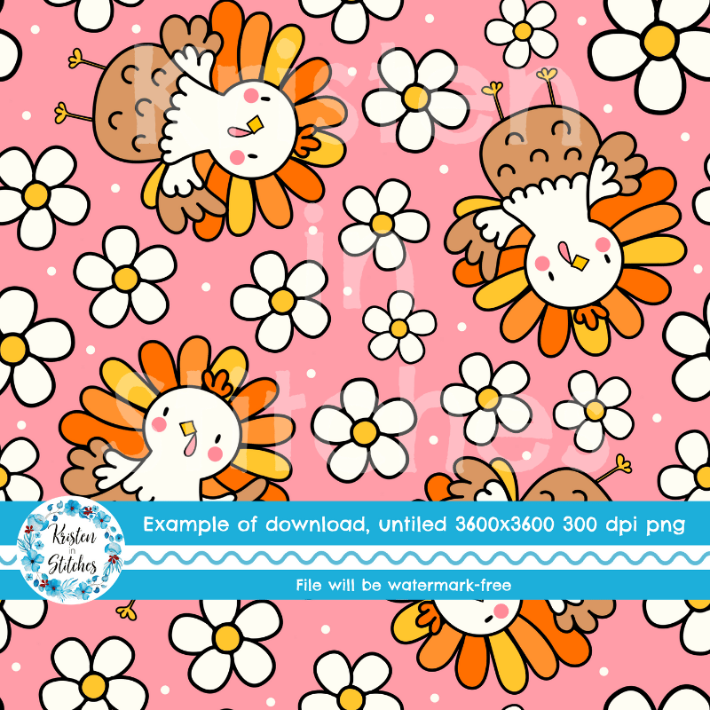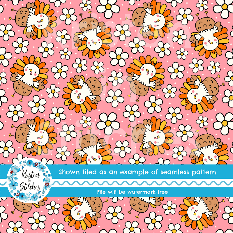 Sweet Thanksgiving Turkeys and Daisy Flowers Seamless Pattern